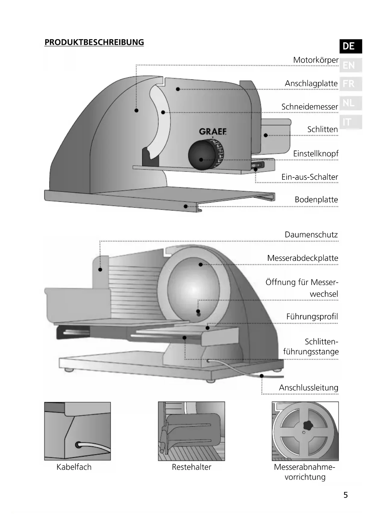 - immer gut abschneiden mit Graef! gefahr in hauchdünne, ovale Scheiben geschnitten werden – das sorgt nicht nur für ein intensiveres Aroma, sondern verkürzt auch die Garzeit. Der MiniSlice-Aufsatz, verschiedene Messerschärfersets sowie integrierbare Schneidbretter in verschiedenen Farben aus hochwertigem, messerschonendem und lebensmittelechtem Kunststoff er- leichtern das parallele Schneiden ver- schiedener Speisen.4 Inhalt Produktbeschreibung p. 5