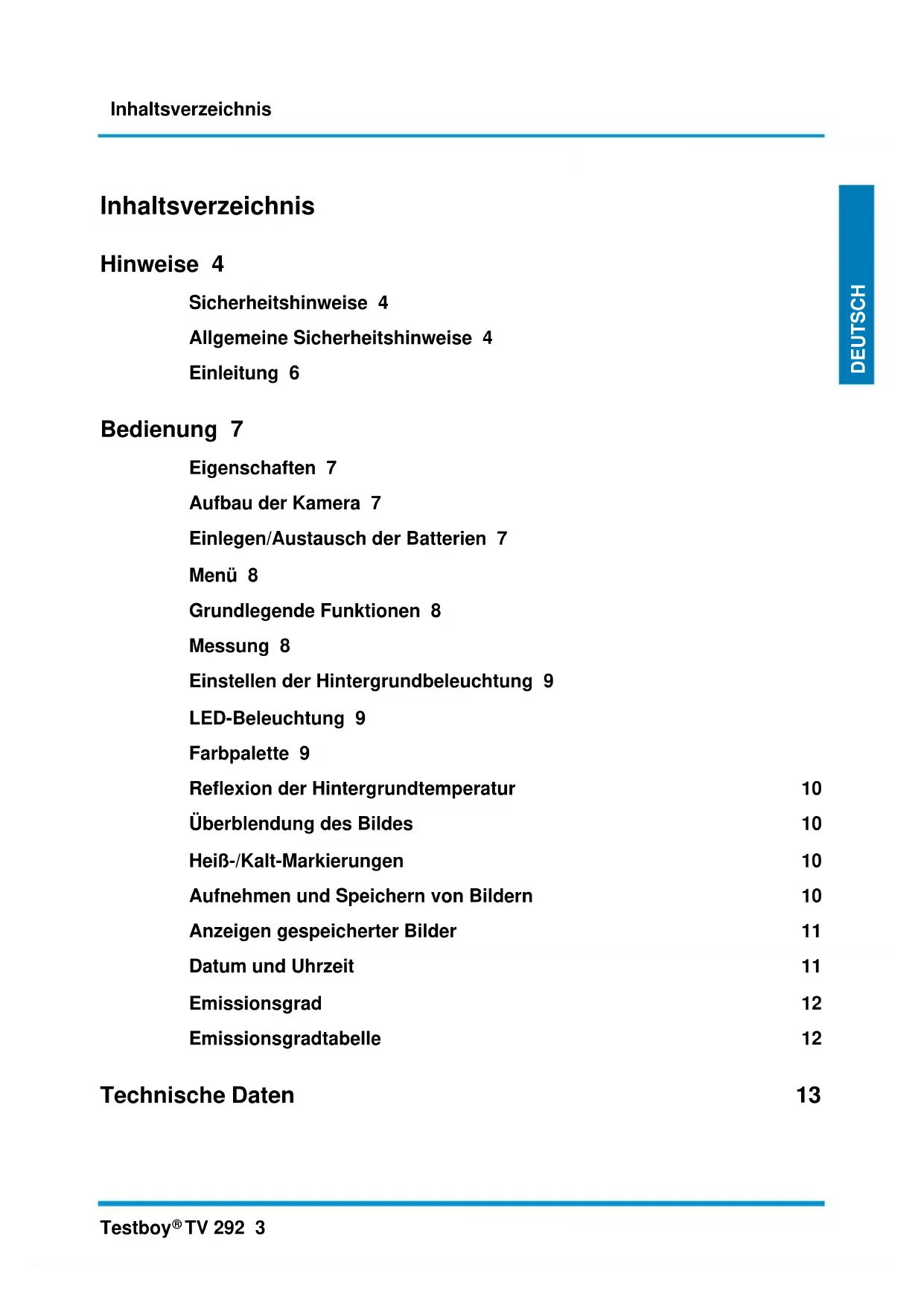 TV 292 3 ENGLISH DEUTSCH Inhaltsverzeichnis Hinweise 4 Sicherheitshinweise 4 Allgemeine Sicherheitshinweise 4 Einleitung 6 Bedienung 7 Eigenschaften 7 Aufbau der Kamera 7 Einlegen/Austausch der Batterien 7 Menü 8 Grundlegende Funktionen 8 Messung 8 Einstellen der Hintergrundbeleuchtung 9 LED-Beleuchtung 9 Farbpalette 9 Reflexion der Hintergrundtemperatur 10 Überblendung des Bildes 10 Heiß-/Kalt-Markierungen 10 Aufnehmen und Speichern von Bildern 10 Anzeigen gespeicherter Bilder 11 Datum und Uhrzeit 11 Emissionsgrad 12 Emissionsgradtabelle 12 Technische Daten 13Hinweise 4 Testboy
