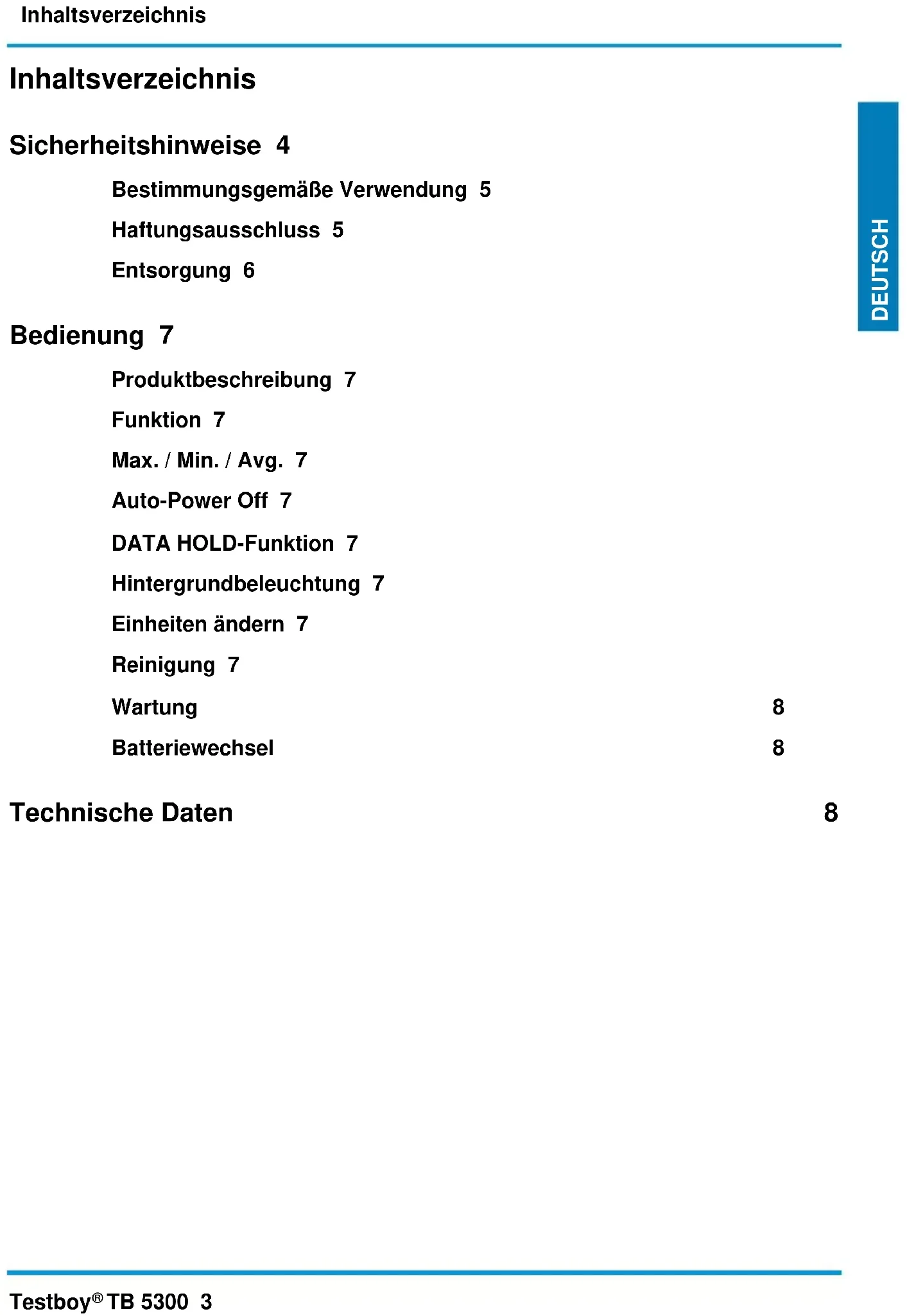 TB 5300 3 DEUTSCH Inhaltsverzeichnis Sicherheitshinweise 4 Bestimmungsgemäße Verwendung 5 Haftungsausschluss 5 Entsorgung 6 Bedienung 7 Produktbeschreibung 7 Funktion 7 Max. / Min. / Avg. 7 Auto-Power Off 7 DATA HOLD-Funktion 7 Hintergrundbeleuchtung 7 Einheiten ändern 7 Reinigung 7 Wartung 8 Batteriewechsel 8 Technische Daten 8Sicherheitshinweise 4 Testboy
