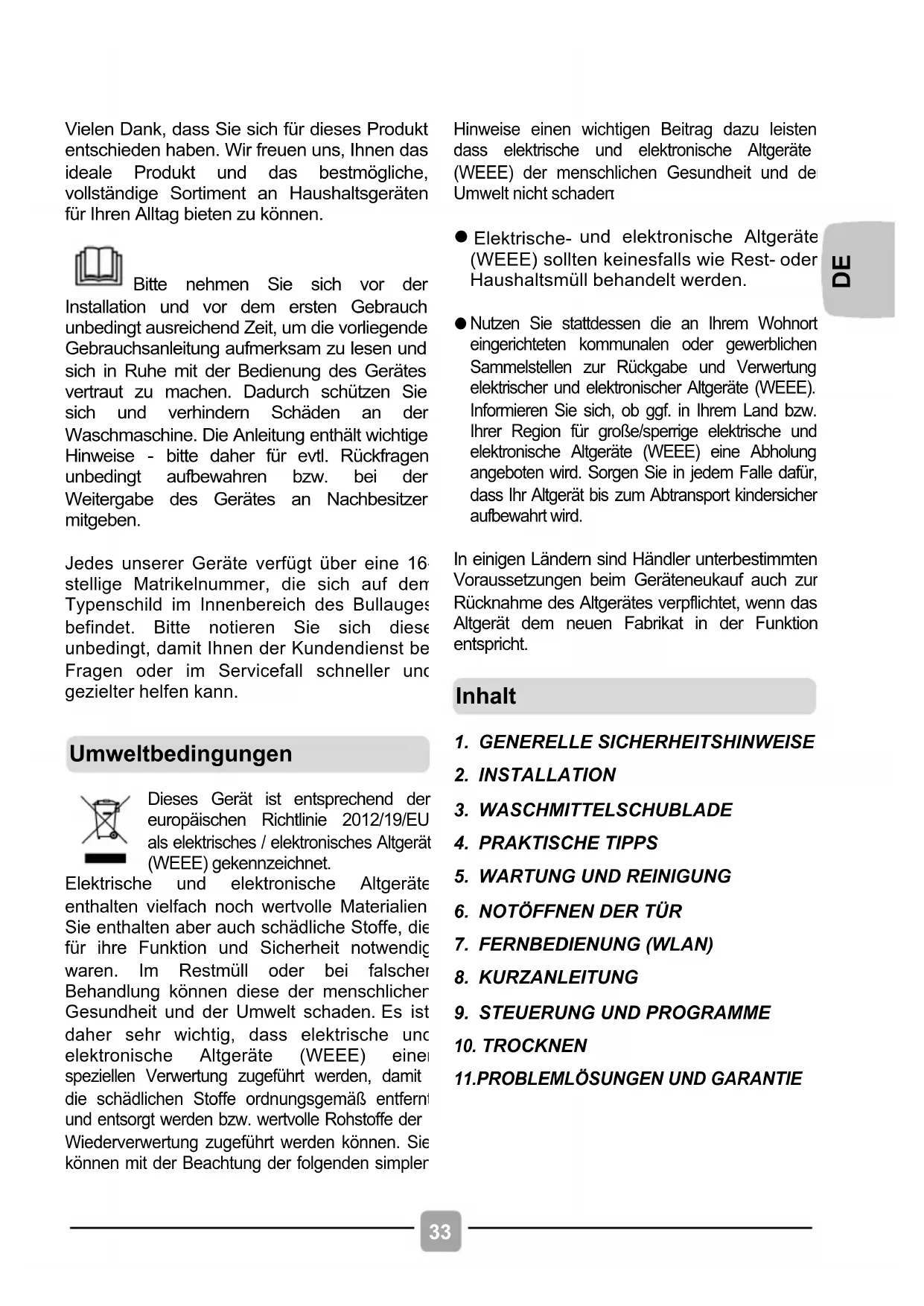 Bitte nehmen Sie sich vor der Installation und vor dem ersten Gebrauch unbedingt ausreichend Zeit, um die vorliegende Gebrauchsanleitung aufmerksam zu lesen und sich in Ruhe mit der Bedienung des Gerätes vertraut zu machen. Dadurch schützen Sie sich und verhindern Schäden an der Waschmaschine. Die Anleitung enthält wichtige Hinweise