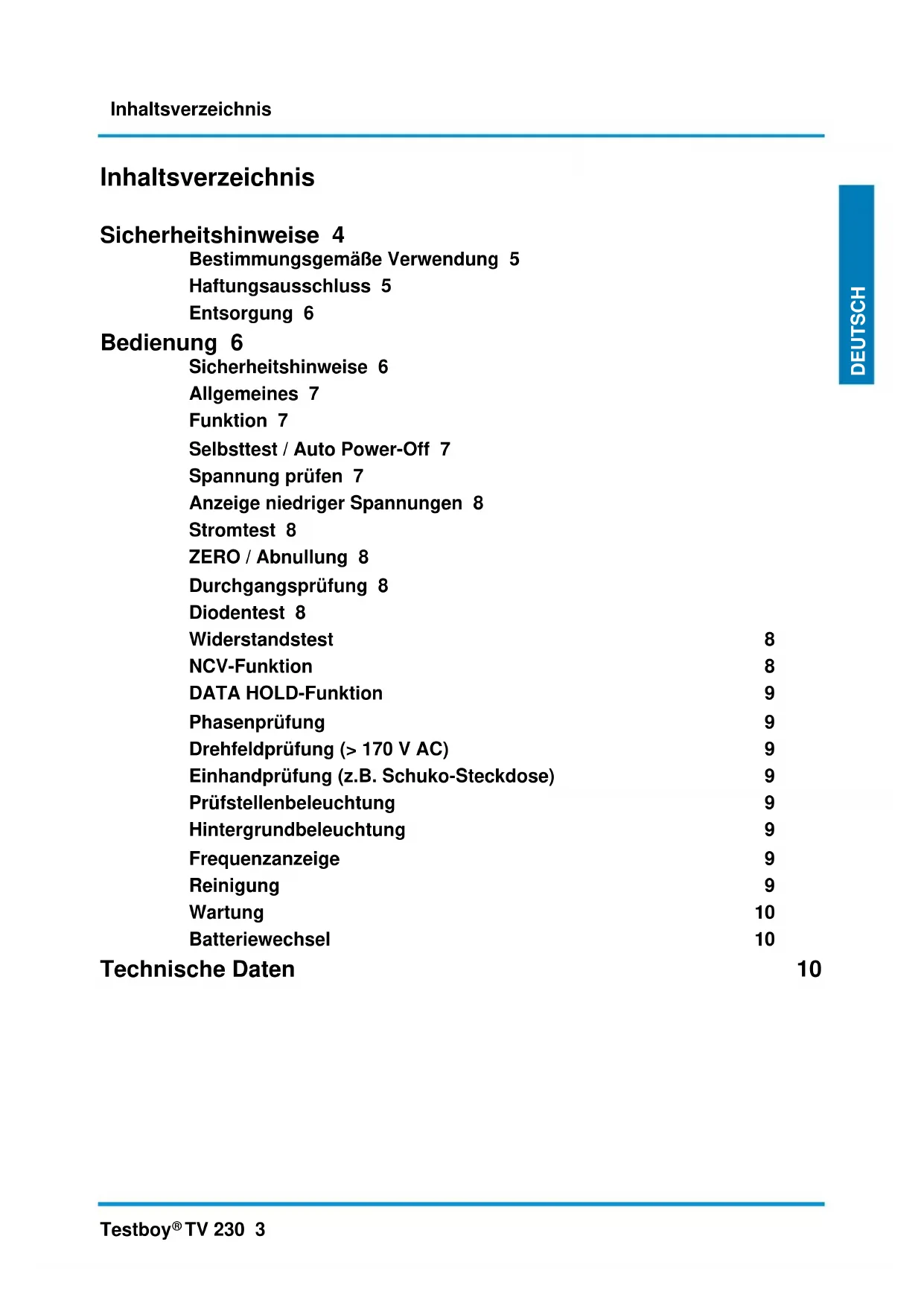 TV 230 3 DEUTSCH Inhaltsverzeichnis Sicherheitshinweise 4 Bestimmungsgemäße Verwendung 5 Haftungsausschluss 5 Entsorgung 6 Bedienung 6 Sicherheitshinweise 6 Allgemeines 7 Funktion 7 Selbsttest / Auto Power-Off 7 Spannung prüfen 7 Anzeige niedriger Spannungen 8 Stromtest 8 ZERO / Abnullung 8 Durchgangsprüfung 8 Diodentest 8 Widerstandstest 8 NCV-Funktion 8 DATA HOLD-Funktion 9 Phasenprüfung 9 Drehfeldprüfung (> 170 V AC) 9 Einhandprüfung (z.B. Schuko-Steckdose) 9 Prüfstellenbeleuchtung 9 Hintergrundbeleuchtung 9 Frequenzanzeige 9 Reinigung 9 Wartung 10 Batteriewechsel 10 Technische Daten 10Sicherheitshinweise 4 Testboy