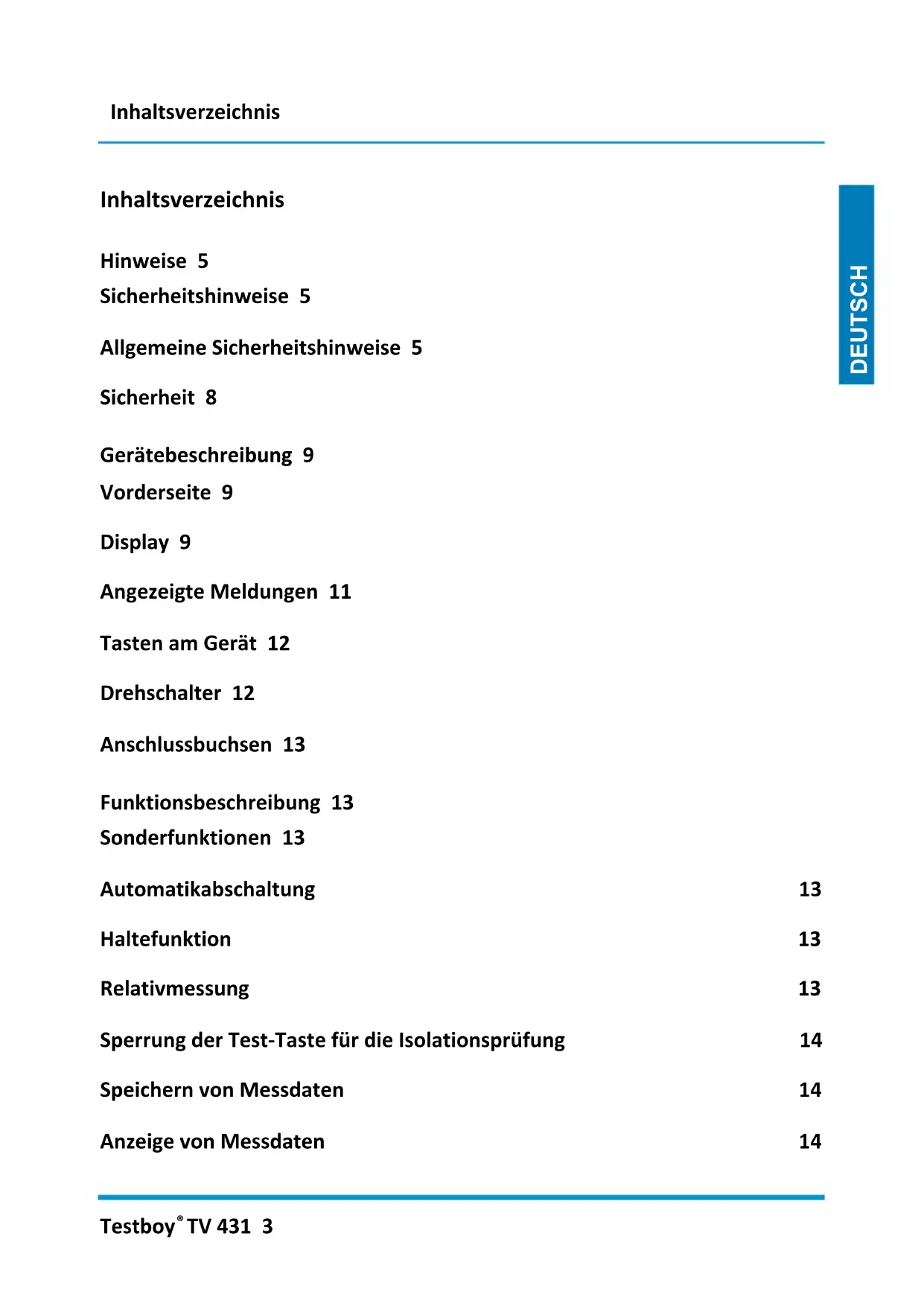 TV 431 3 DEUTSCH Inhaltsverzeichnis Hinweise 5 Sicherheitshinweise 5 Allgemeine Sicherheitshinweise 5 Sicherheit 8 Gerätebeschreibung 9 Vorderseite 9 Display 9 Angezeigte Meldungen 11 Tasten am Gerät 12 Drehschalter 12 Anschlussbuchsen 13 Funktionsbeschreibung 13 Sonderfunktionen 13 Automatikabschaltung 13 Haltefunktion 13 Relativmessung 13 Sperrung der Test-Taste für die Isolationsprüfung 14 Speichern von Messdaten 14 Anzeige von Messdaten 14Inhaltsverzeichnis Testboy