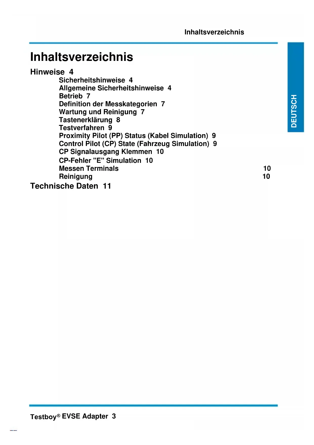EVSE Adapter 3 DEUTSCH DEUTSCH DEUTSCH Inhaltsverzeichnis Hinweise 4 Sicherheitshinweise 4 Allgemeine Sicherheitshinweise 4 Betrieb 7 Definition der Messkategorien 7 Wartung und Reinigung 7 Tastenerklärung 8 Testverfahren 9 Proximity Pilot (PP) Status (Kabel Simulation) 9 Control Pilot (CP) State (Fahrzeug Simulation) 9 CP Signalausgang Klemmen 10 CP-Fehler "E" Simulation 10 Messen Terminals 10 Reinigung 10 Technische Daten 11Hinweise 4 Testboy