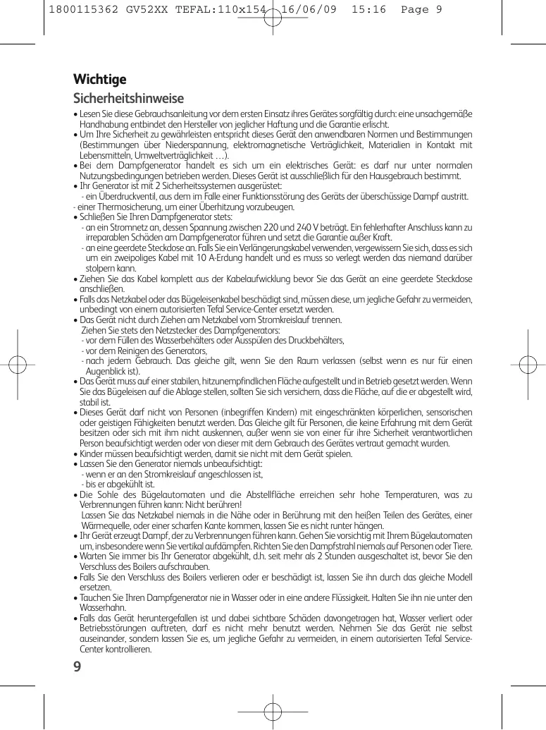 Wichtige Sicherheitshinweise • Lesen Sie diese Gebrauchsanleitung vor dem ersten Einsatz ihres Gerätes sorgfältig durch: eine unsachgemäße Handhabung entbindet den Hersteller von jeglicher Haftung und die Garantie erlischt. • Um Ihre Sicherheit zu gewährleisten entspricht dieses Gerät den anwendbaren Normen und Bestimmungen (Bestimmungen über Niederspannung, elektromagnetische Verträglichkeit, Materialien in Kontakt mit Lebensmitteln, Umweltverträglichkeit …). • Bei dem Dampfgenerator handelt es sich um ein elektrisches Gerät: es darf nur unter normalen Nutzungsbedingungen betrieben werden. Dieses Gerät ist ausschließlich für den Hausgebrauch bestimmt. • Ihr Generator ist mit 2 Sicherheitssystemen ausgerüstet: - ein Überdruckventil, aus dem im Falle einer Funktionsstörung des Geräts der überschüssige Dampf austritt. - einer Thermosicherung, um einer Überhitzung vorzubeugen. • Schließen Sie Ihren Dampfgenerator stets: - an ein Stromnetz an, dessen Spannung zwischen 220 und 240 V beträgt. Ein fehlerhafter Anschluss kann zu irreparablen Schäden am Dampfgenerator führen und setzt die Garantie außer Kraft. - an eine geerdete Steckdose an. Falls Sie ein Verlängerungskabel verwenden, vergewissern Sie sich, dass es sich um ein zweipoliges Kabel mit 10 A-Erdung handelt und es muss so verlegt werden das niemand darüber stolpern kann. • Ziehen Sie das Kabel komplett aus der Kabelaufwicklung bevor Sie das Gerät an eine geerdete Steckdose anschließen. • Falls das Netzkabel oder das Bügeleisenkabel beschädigt sind, müssen diese, um jegliche Gefahr zu vermeiden, unbedingt von einem autorisierten Tefal Service-Center ersetzt werden. • Das Gerät nicht durch Ziehen am Netzkabel vom Stromkreislauf trennen. Ziehen Sie stets den Netzstecker des Dampfgenerators: - vor dem Füllen des Wasserbehälters oder Ausspülen des Druckbehälters, - vor dem Reinigen des Generators, - nach jedem Gebrauch. Das gleiche gilt, wenn Sie den Raum verlassen (selbst wenn es nur für einen Augenblick ist). • Das Gerät muss auf einer stabilen, hitzunempfindlichen Fläche aufgestellt und in Betrieb gesetzt werden. Wenn Sie das Bügeleisen auf die Ablage stellen, sollten Sie sich versichern, dass die Fläche, auf die er abgestellt wird, stabil ist. • Dieses Gerät darf nicht von Personen (inbegriffen Kindern) mit eingeschränkten körperlichen, sensorischen oder geistigen Fähigkeiten benutzt werden. Das Gleiche gilt für Personen, die keine Erfahrung mit dem Gerät besitzen oder sich mit ihm nicht auskennen, außer wenn sie von einer für ihre Sicherheit verantwortlichen Person beaufsichtigt werden oder von dieser mit dem Gebrauch des Gerätes vertraut gemacht wurden. • Kinder müssen beaufsichtigt werden, damit sie nicht mit dem Gerät spielen. • Lassen Sie den Generator niemals unbeaufsichtigt: - wenn er an den Stromkreislauf angeschlossen ist, - bis er abgekühlt ist. • Die Sohle des Bügelautomaten und die Abstellfläche erreichen sehr hohe Temperaturen, was zu Verbrennungen führen kann: Nicht berühren! Lassen Sie das Netzkabel niemals in die Nähe oder in Berührung mit den heißen Teilen des Gerätes, einer Wärmequelle, oder einer scharfen Kante kommen, lassen Sie es nicht runter hängen. • Ihr Gerät erzeugt Dampf, der zu Verbrennungen führen kann. Gehen Sie vorsichtig mit Ihrem Bügelautomaten um, insbesondere wenn Sie vertikal aufdämpfen. Richten Sie den Dampfstrahl niemals auf Personen oder Tiere. • Warten Sie immer bis Ihr Generator abgekühlt, d.h. seit mehr als 2 Stunden ausgeschaltet ist, bevor Sie den Verschluss des Boilers aufschrauben. • Falls Sie den Verschluss des Boilers verlieren oder er beschädigt ist, lassen Sie ihn durch das gleiche Modell ersetzen. • Tauchen Sie Ihren Dampfgenerator nie in Wasser oder in eine andere Flüssigkeit. Halten Sie ihn nie unter den Wasserhahn. • Falls das Gerät heruntergefallen ist und dabei sichtbare Schäden davongetragen hat, Wasser verliert oder Betriebsstörungen auftreten, darf es nicht mehr benutzt werden. Nehmen Sie das Gerät nie selbst auseinander, sondern lassen Sie es, um jegliche Gefahr zu vermeiden, in einem autorisierten Tefal ServiceCenter kontrollieren.