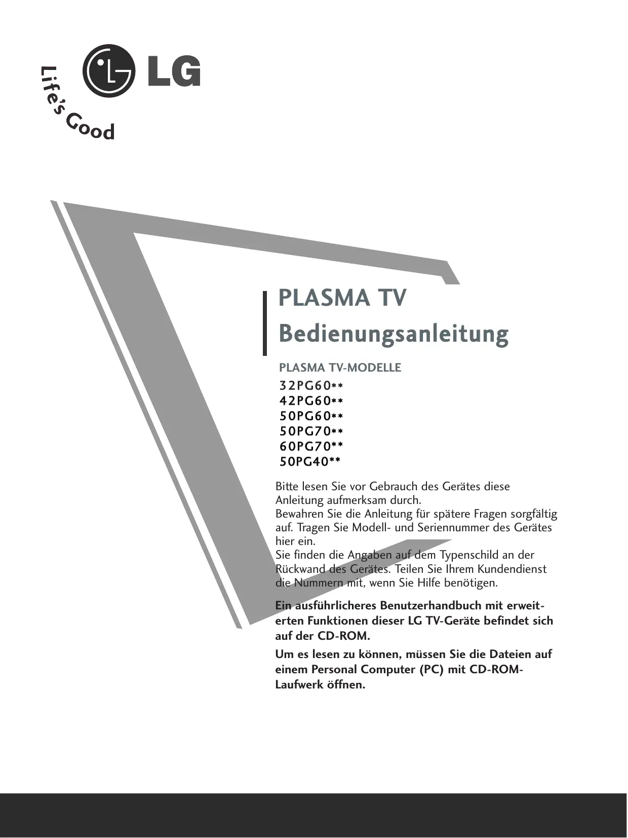 Laden Sie die Anleitung für Ihr Fernseher kostenlos im PDF-Format! Finden Sie Ihr Handbuch 32PG6000 - LG und nehmen Sie Ihr elektronisches Gerät wieder in die Hand. Auf dieser Seite sind alle Dokumente veröffentlicht, die für die Verwendung Ihres Geräts notwendig sind. 32PG6000 von der Marke LG.