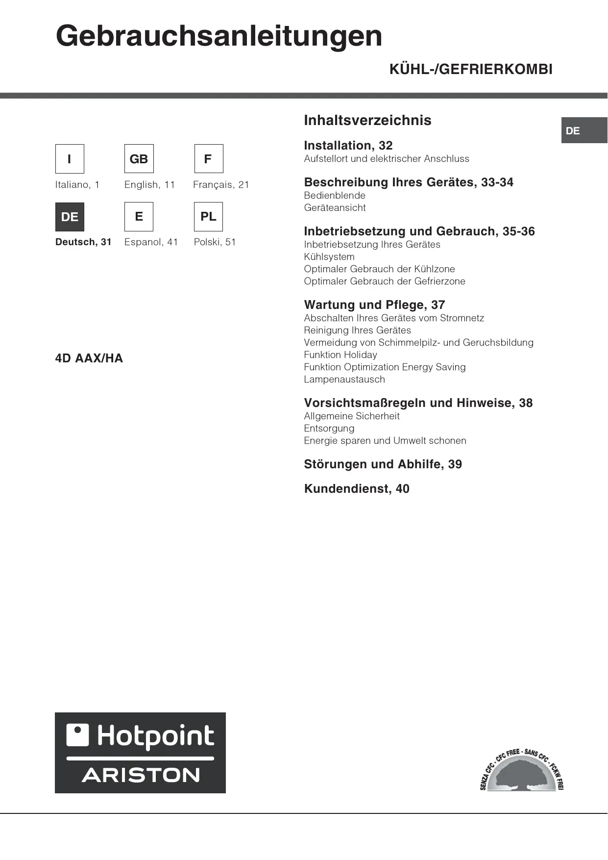 Laden Sie die Anleitung für Ihr Kühl-Gefrier-Kombination kostenlos im PDF-Format! Finden Sie Ihr Handbuch 4D AAB/HA, 4D AAB/HA - HOTPOINT und nehmen Sie Ihr elektronisches Gerät wieder in die Hand. Auf dieser Seite sind alle Dokumente veröffentlicht, die für die Verwendung Ihres Geräts notwendig sind. 4D AAB/HA, 4D AAB/HA von der Marke HOTPOINT.