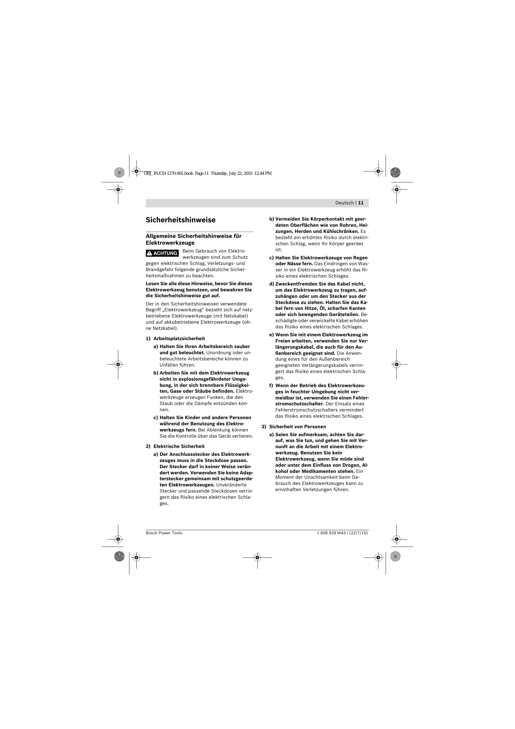 Vous êtes un utilisateur, contactez : Le Service Clientèle Bosch Outillage Electroportatif Tel. : 0 811 36 01 22 (coût d’une communication locale) Fax : +33 (0) 1 49 45 47 67 Ne jetez pas les outils électroportatifs avec les ordures ménagères ! Seulement pour les pays de l’Union Européenne : Conformément à la directive européenne 2002/96/CE relative aux déchets d’équipements électriques et électroniques et sa mise en vigueur conformément aux législations nationales, les outils électroportatifs dont on ne peut plus se servir doivent être isolés et suivre une voie de recyclage appropriée. Sous réserve de modifications.