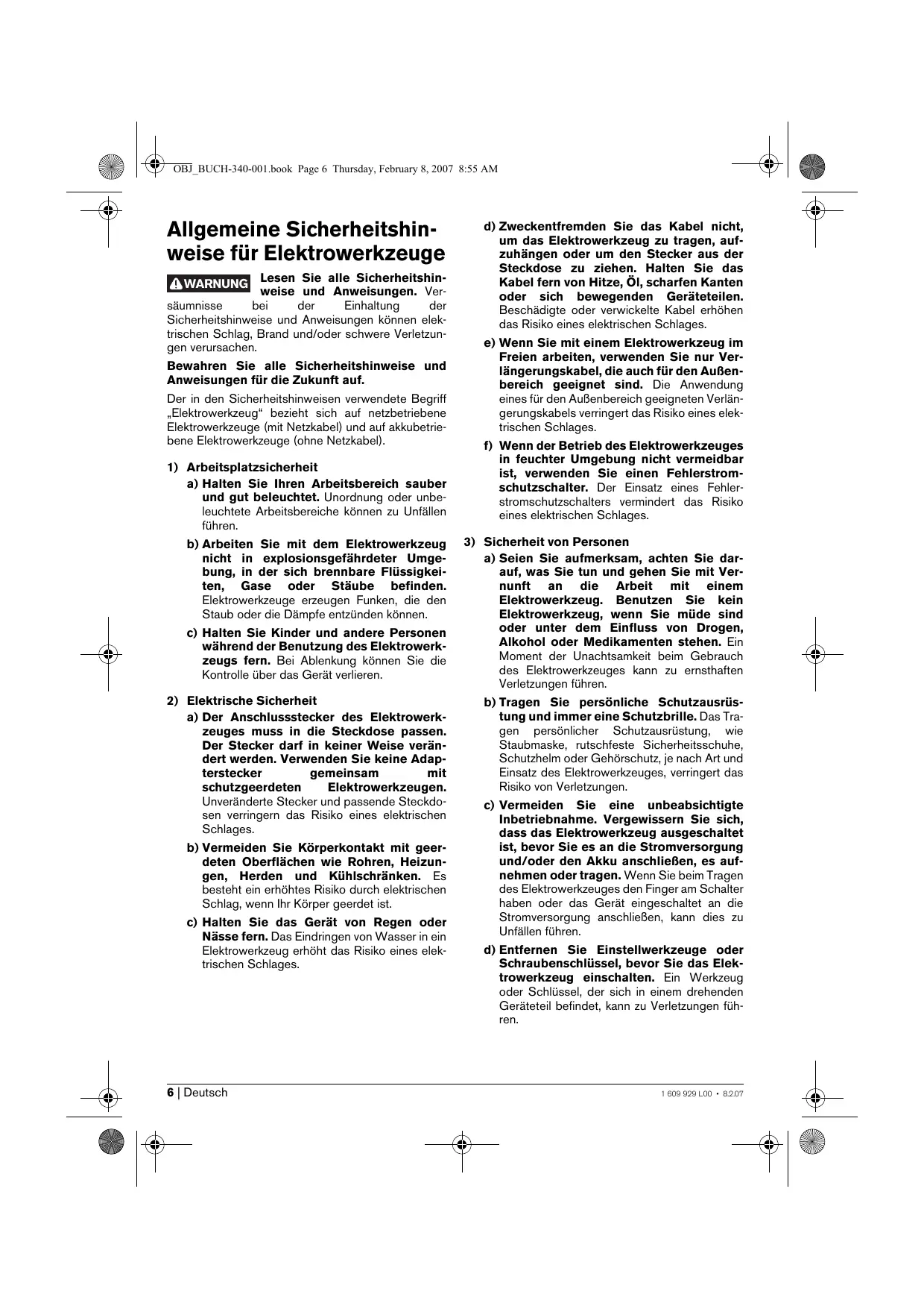 1 609 929 L00 • 17.1.07 OBJ_BUCH-340-001.book Page 6 Thursday, February 8, 2007 8:55 AM Allgemeine Sicherheitshinweise für Elektrowerkzeuge WARNUNG Lesen Sie alle Sicherheitshinweise und Anweisungen. Versäumnisse bei der Einhaltung der Sicherheitshinweise und Anweisungen können elektrischen Schlag, Brand und/oder schwere Verletzungen verursachen. Bewahren Sie alle Sicherheitshinweise und Anweisungen für die Zukunft auf. Der in den Sicherheitshinweisen verwendete Begriff „Elektrowerkzeug“ bezieht sich auf netzbetriebene Elektrowerkzeuge (mit Netzkabel) und auf akkubetriebene Elektrowerkzeuge (ohne Netzkabel).