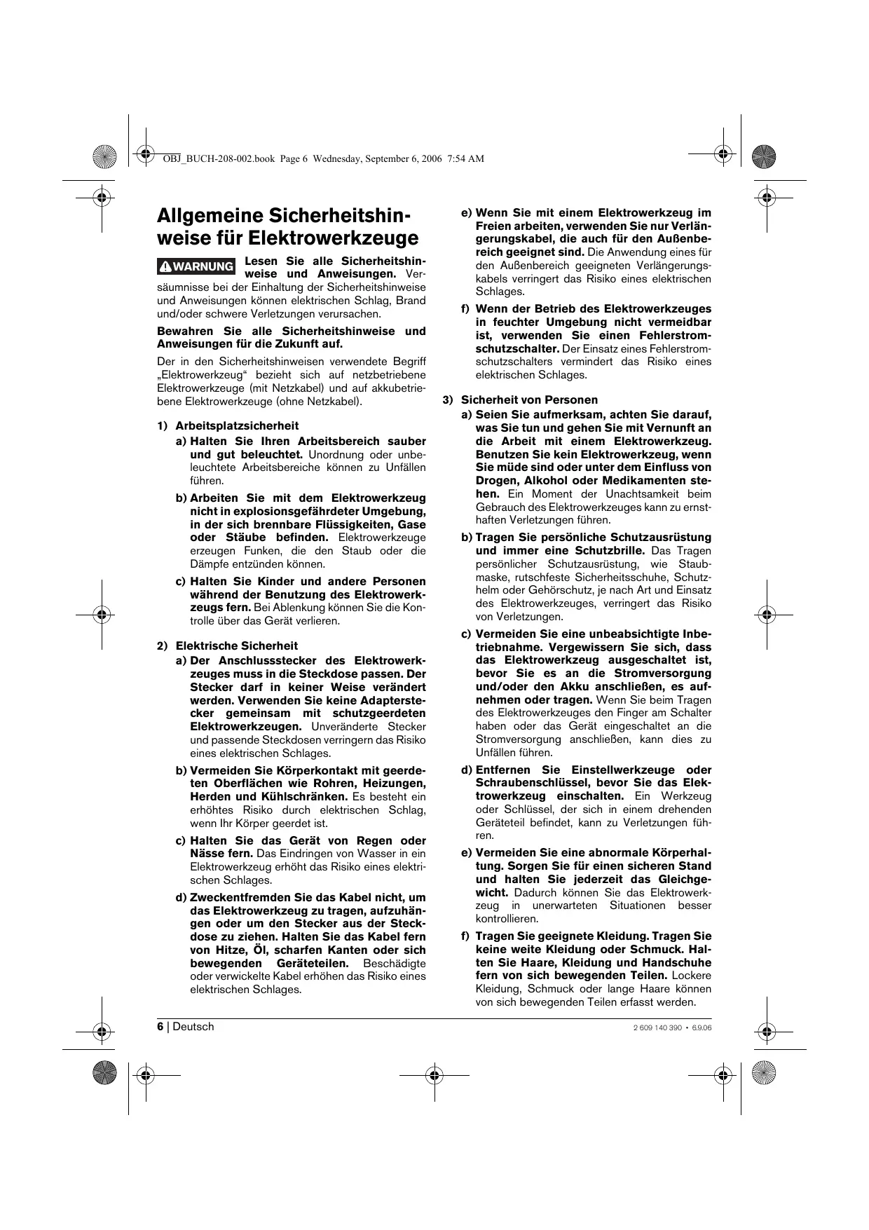 2 609 140 390 • 6.9.06 OBJ_BUCH-208-002.book Page 6 Wednesday, September 6, 2006 7:54 AM Allgemeine Sicherheitshinweise für Elektrowerkzeuge WARNUNG Lesen Sie alle Sicherheitshinweise und Anweisungen. Versäumnisse bei der Einhaltung der Sicherheitshinweise und Anweisungen können elektrischen Schlag, Brand und/oder schwere Verletzungen verursachen. Bewahren Sie alle Sicherheitshinweise und Anweisungen für die Zukunft auf. Der in den Sicherheitshinweisen verwendete Begriff „Elektrowerkzeug“ bezieht sich auf netzbetriebene Elektrowerkzeuge (mit Netzkabel) und auf akkubetriebene Elektrowerkzeuge (ohne Netzkabel).