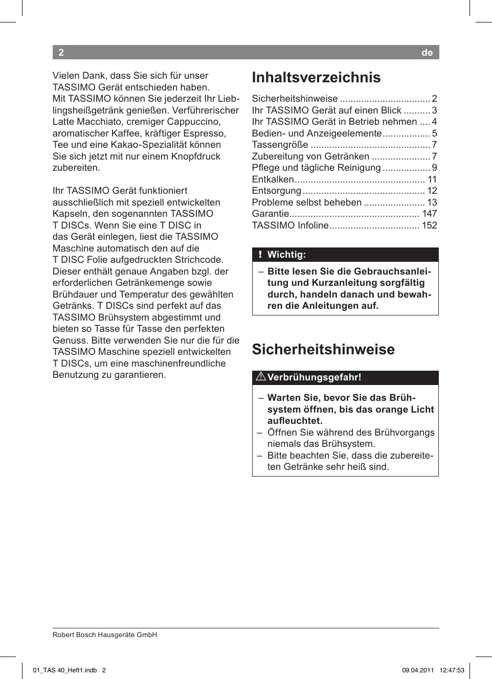 - TASSIMO Infoline !! Wichtig: –– Bitte lesen Sie die Gebrauchsanlei tung und Kurzanleitung sorgfältig durch, handeln danach und bewah ren die Anleitungen auf. Sicherheitshinweise ¡¡Verbrühungsgefahr! –– Warten Sie, bevor Sie das Brüh system öffnen, bis das orange Licht aufleuchtet. –– Öffnen Sie während des Brühvorgangs niemals das Brühsystem. –– Bitte beachten Sie, dass die zubereiteten Getränke sehr heiß sind. Robert Bosch Hausgeräte GmbH 01_TAS 40_Heft1.indb 2 p. 152