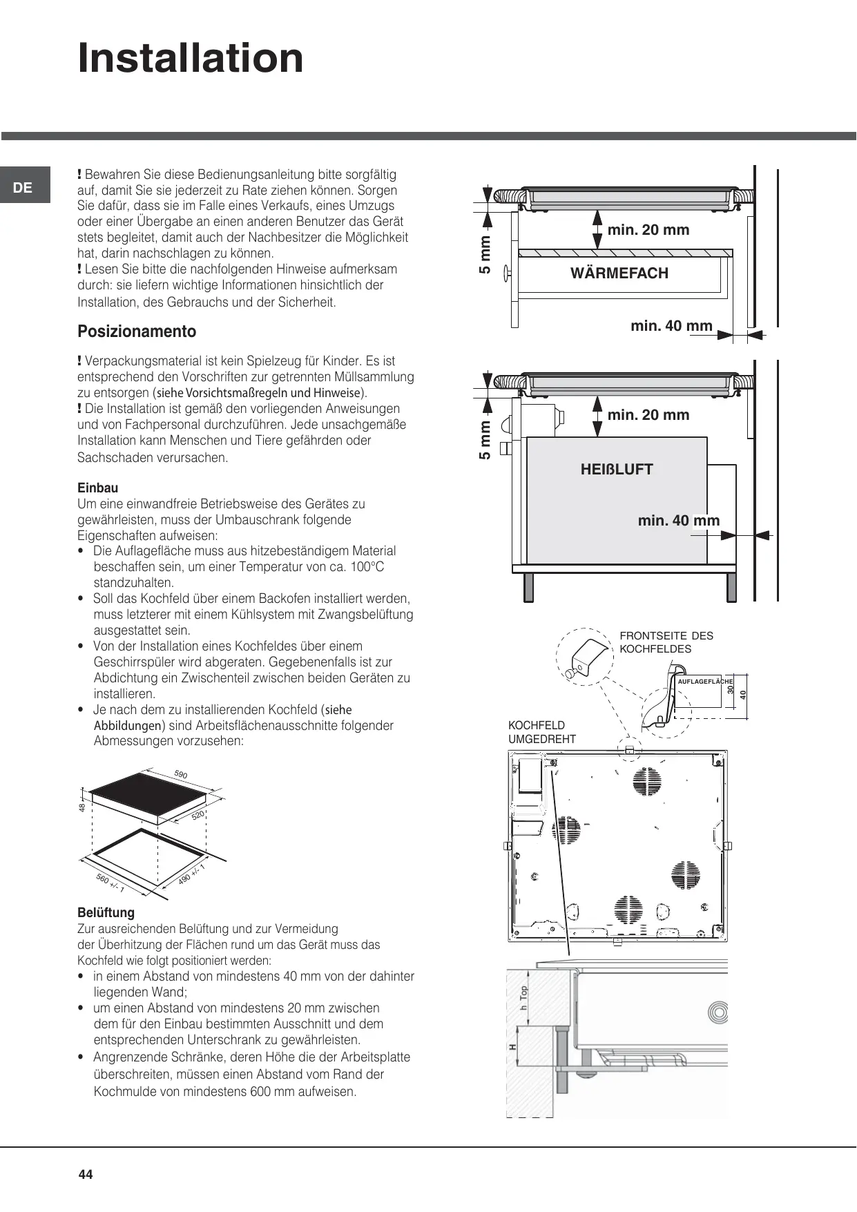 TIROIR • de manière à ce qu’il reste au moins 20 mm de distance entre la découpe d’encastrement et le meuble en dessous. • Les meubles jouxtant la table, dont la hauteur dépasse celle du plan de cuisson, doivent être placés à au moins 600 mm du bord du plan.