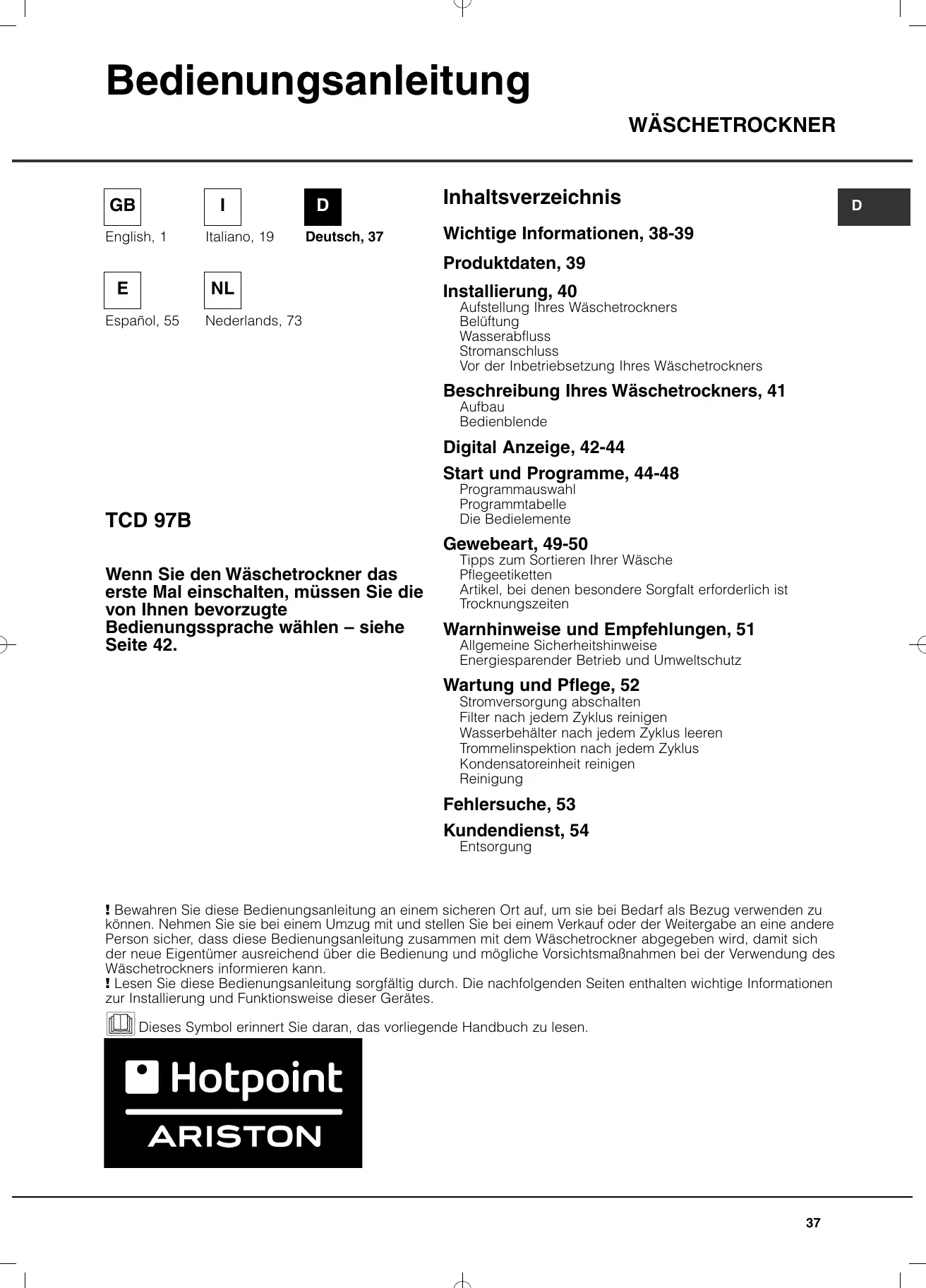 Finden Sie kostenlos die Bedienungsanleitung des Geräts TCD 97B 6HY/N HOTPOINT als PDF.