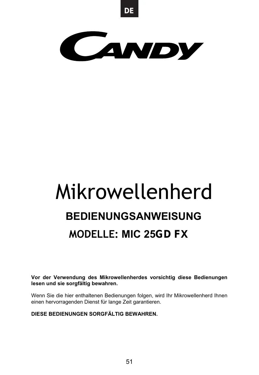 Laden Sie die Anleitung für Ihr Mikrowellen kostenlos im PDF-Format! Finden Sie Ihr Handbuch MIC25GDFX - CANDY und nehmen Sie Ihr elektronisches Gerät wieder in die Hand. Auf dieser Seite sind alle Dokumente veröffentlicht, die für die Verwendung Ihres Geräts notwendig sind. MIC25GDFX von der Marke CANDY.
