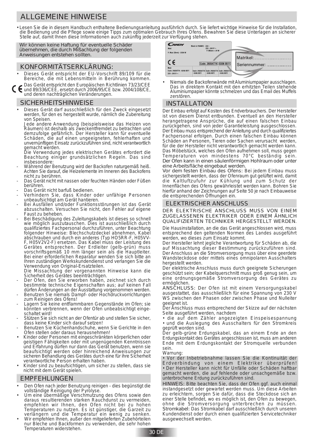 um die Pyrolyse abzubrechen, aber der Backofen ist noch sehr heiß, erscheint im Display die Anzeige 0- - n als Warnung, dass die Tür noch verriegelt ist. TECHNISCHER KUNDENDIENST Sollte Ihr Backofen einmal nicht richtig funktionieren, prüfen Sie zuerst, ob die Stromversorgung gewährleistet ist. Ist die Ursache der Fehlfunktion nicht ausfindig zu machen, wenden Sie sich bitte an Ihren zuständigen Werkskundendienst unter Angabe des Modells und der Seriennummer, die auf dem Typenschild angegeben sind. Auf Ihr Gerät gewähren wir eine Garantie von 24 Monaten ab Kaufdatum. Bewahren Sie Ihre Kaufrechnung sorgfältig auf und legen Sie sie bei Bedarf als Garantienachweis dem Kundendienst vor. Die Garantiebedingungen sind im beigefügten Serviceheft angegeben. WICHTIG : Dieses Elektrohaushaltsgerät ist entsprechend der EU-Richtlinie 2002/96/CE über Elektro- und Elektronik-Altgeräte (WEEE) gekennzeichnet. Bitte sorgen Sie dafür, dass das Gerät ordnungsgemäß entsorgt wird, damit mögliche negative Auswirkungen auf Umwelt und Gesundheit vermieden werden, die bei einer unsachgemäßen Entsorgung des Altgerätes entstehen könnten. Das Symbol auf dem Produkt bedeutet, dass dieses Gerät nicht in den normalen Hausmüll gehört, sondern den jeweiligen kommunalen Rücknahmesystemen für Elektro- und ElektronikAltgeräte übergeben werden muss. Die Entsorgung muss im Einklang mit den geltenden Umweltrichtlinien für die Abfallentsorgung erfolgen. Für nähere Informationen über Entsorgung und Recycling dieses Produktes wenden Sie sich bitte an Ihre kommunalen Einrichtungen (Umweltamt) oder an die Abfallentsorgungsgesellschaft Ihrer Stadt bzw. an Ihren Händler. - Vor der Pyrolyse: