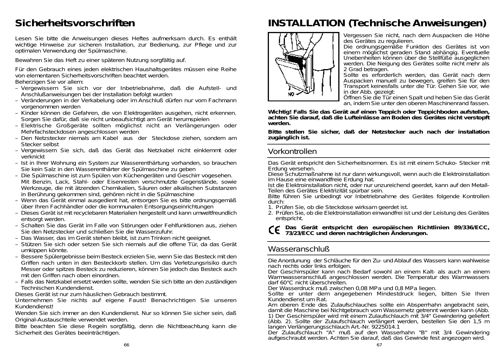 Par conséquent, avant de brancher la machine sur le circuit électrique s'assurer: 1) Que la prise murale est correctement reliée à la terre. 2) Que le réglage du contacteur électrique correspond bien à la puissance absorbée indiquée sur la plaque signalétique du lave-vaisselle. Le constructeur décline toute responsabilité pour des dommages éventuels survenus aux personnes et aux biens imputables à un mauvais raccordement de la ligne de terre. Cet appareil est conforme aux directives 89/336/EEC, 73/23/EEC et modifications successives.