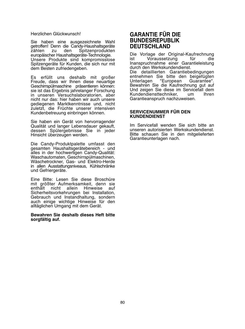 Candy est heureux de vous proposer cette nouvelle machine, fruit d’années de recherches et d’expériences confirmées sur le marché. Vous avez choisi la qualité, la fiabilité et les prestations techniques élevées. Candy vous propose de plus, une gamme complète d’appareils d’électroménagers: machines-à-laver, lave-vaisselle, machines-à-laver séchantes, séche-linge, four à micro-ondes, fours et plaques de cuisson, réfrigérateurs et congélateurs. Demandez à votre Revendeur le catalogue complet des produits Candy. Nous vous prions de lire attentivement les indications contenues dans ce mode d’emploi. Vous y trouverez d’importantes indications, sur la sécurité d’installation, d’emploi, de manutention et d’autres conseils utiles pour le meilleur emploi du lave-vaisselle. Conservez avec soin ce mode d’emploi pour des consultations futures.