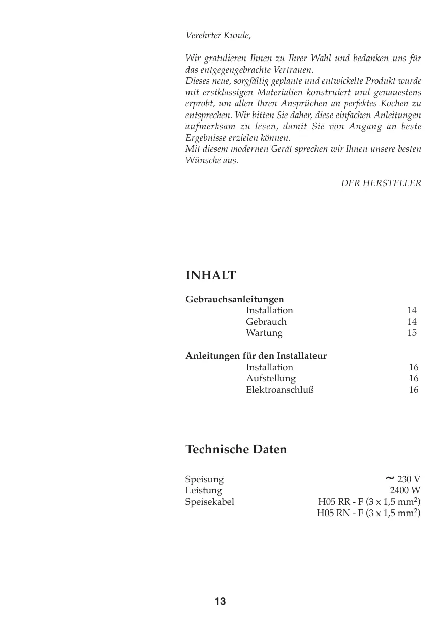 Verehrter Kunde, Wir gratulieren Ihnen zu Ihrer Wahl und bedanken uns für das entgegengebrachte Vertrauen. Dieses neue, sorgfältig geplante und entwickelte Produkt wurde mit erstklassigen Materialien konstruiert und genauestens erprobt, um allen Ihren Ansprüchen an perfektes Kochen zu entsprechen. Wir bitten Sie daher, diese einfachen Anleitungen aufmerksam zu lesen, damit Sie von Angang an beste Ergebnisse erzielen können. Mit diesem modernen Gerät sprechen wir Ihnen unsere besten Wünsche aus. DER HERSTELLER INHALT Gebrauchsanleitungen Installation Gebrauch Wartung
