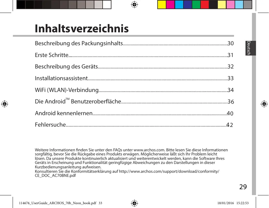 Weitere Informationen finden Sie unter den FAQs unter www.archos.com. Bitte lesen Sie diese Informationen sorgfältig, bevor Sie die Rückgabe eines Produkts erwägen. Möglicherweise läßt sich Ihr Problem leicht lösen. Da unsere Produkte kontinuierlich aktualisiert und weiterentwickelt werden, kann die Software Ihres Geräts in Erscheinung und Funktionalität geringfügige Abweichungen zu den Darstellungen in dieser Kurzbedienungsanleitung aufweisen. Konsultieren Sie die Konformitätserklärung auf http://www.archos.com/support/download/conformity/ CE_DOC_AC70BNE.pdf