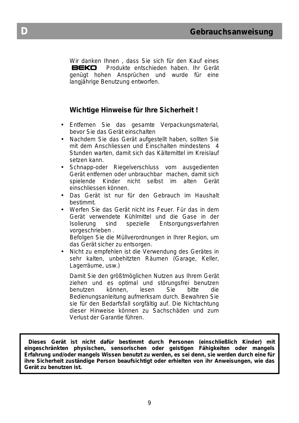 Gebrauchsanweisung Wir danken Ihnen , dass Sie sich für den Kauf eines BEKO Produkte entschieden haben. Ihr Gerät genügt hohen Ansprüchen und wurde für eine langjährige Benutzung entworfen. Wichtige Hinweise für Ihre Sicherheit !