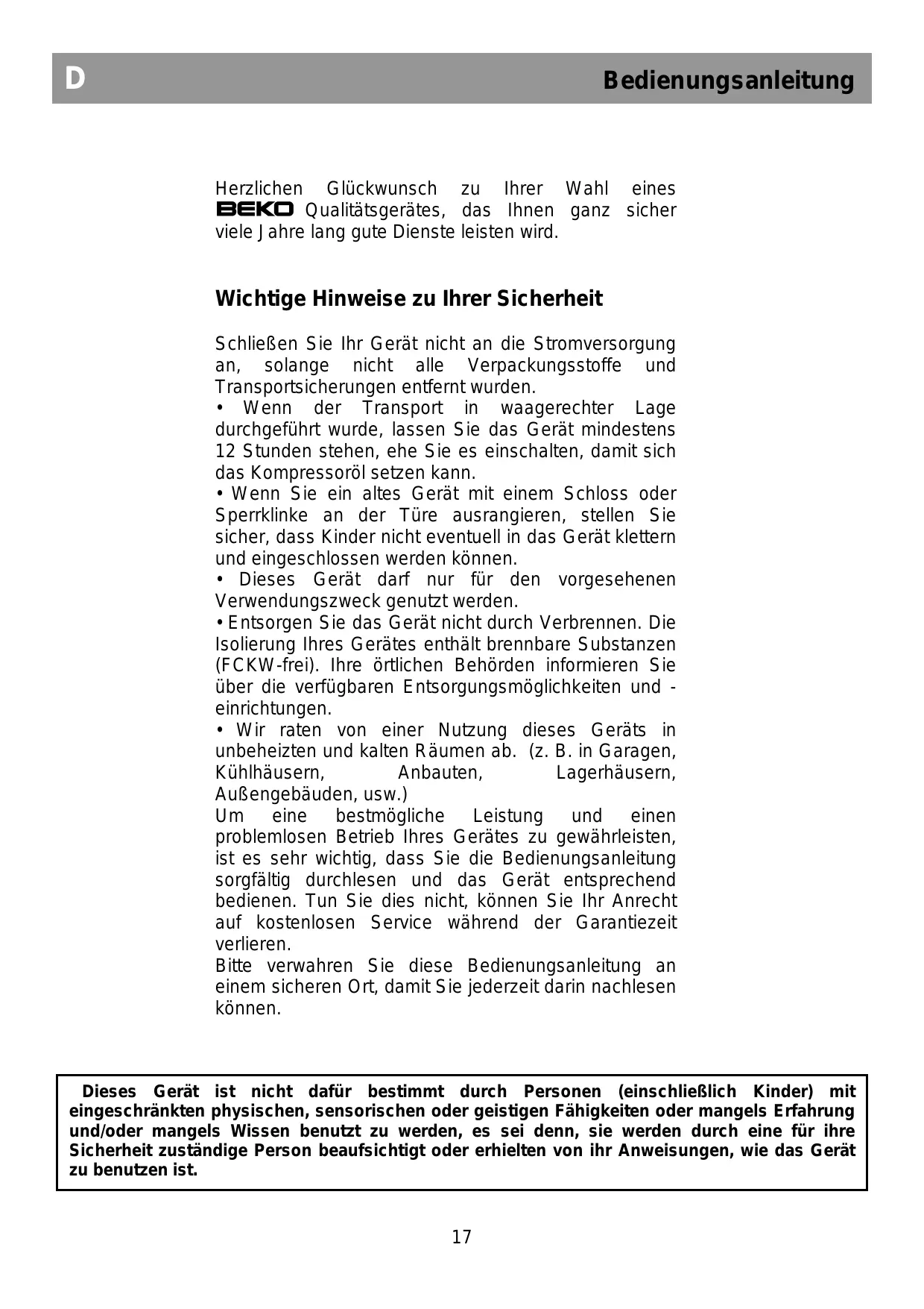 Wichtige Sicherheitshinweise /17 Elektrischer Anschluss /18 Transporthinweise /18 Aufstellen des Gerätes /18 Temperaturkontrolle und –Einstellung /19 Vor der Inbetriebnahme /19 Tiefkühlbereich-Bedienfeld /20 Schnellgefrierfunktion /20 Lagerung von Tiefkühlkost /20 Frische Lebensmittel tiefkühlen /21 Herstellung von Eiswürfeln /21 Lernen Sie Ihr neues Gerät kennen /21 Abtauen /21 Reinigung und Pflege /22 Änderung des Türanschlags /22 Wichtige Hinweise – Bitte beachten! /22 Problemlösung /23 Hinweise zum Betriebsgeräusch /23 Technische Daten /24