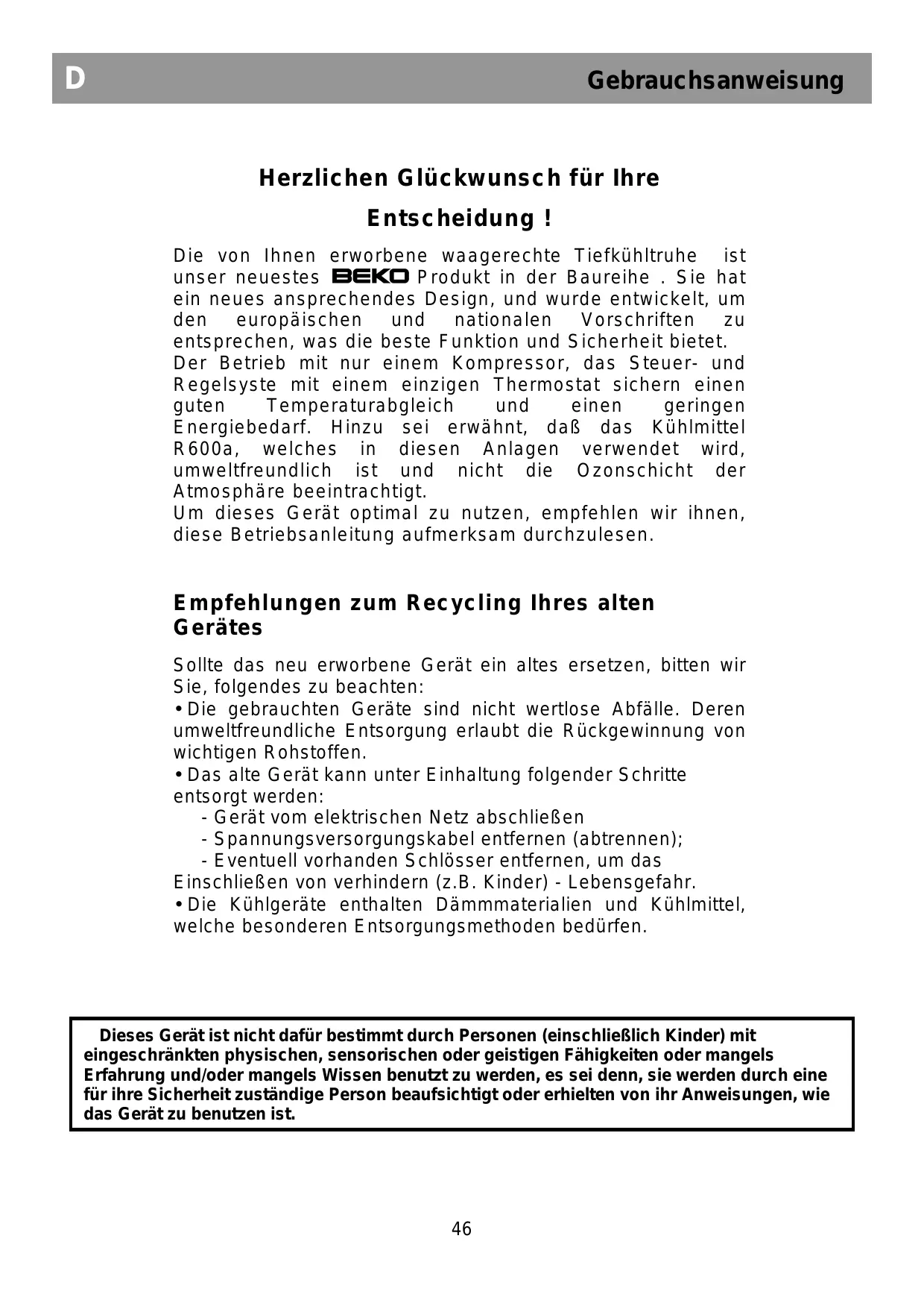 Empfehlungen zum Recycling Ihres alten Gerätes /46 Recycling der Verpackung /47 Transportvorschriften /47 Allgemeine Vorsichtsmaßnahmen und Empfehlungen /47 Die Umgebungstemperatur /48 Anschließen an das Spannungsnetz /48 Inbetriebnahme /49 Beschreibung des Gerätes /49 Einstellen der Temperatur /19 Tiefgefrieren von Lebensmitteln /50 Empfehlungen für das Enteisen des Gerätes /50 Innere Reinigung /51 Äußere Reinigung /51 Erneuern der inneren Glübirne /51 Fehlersuchplan /51 Technische Daten /52