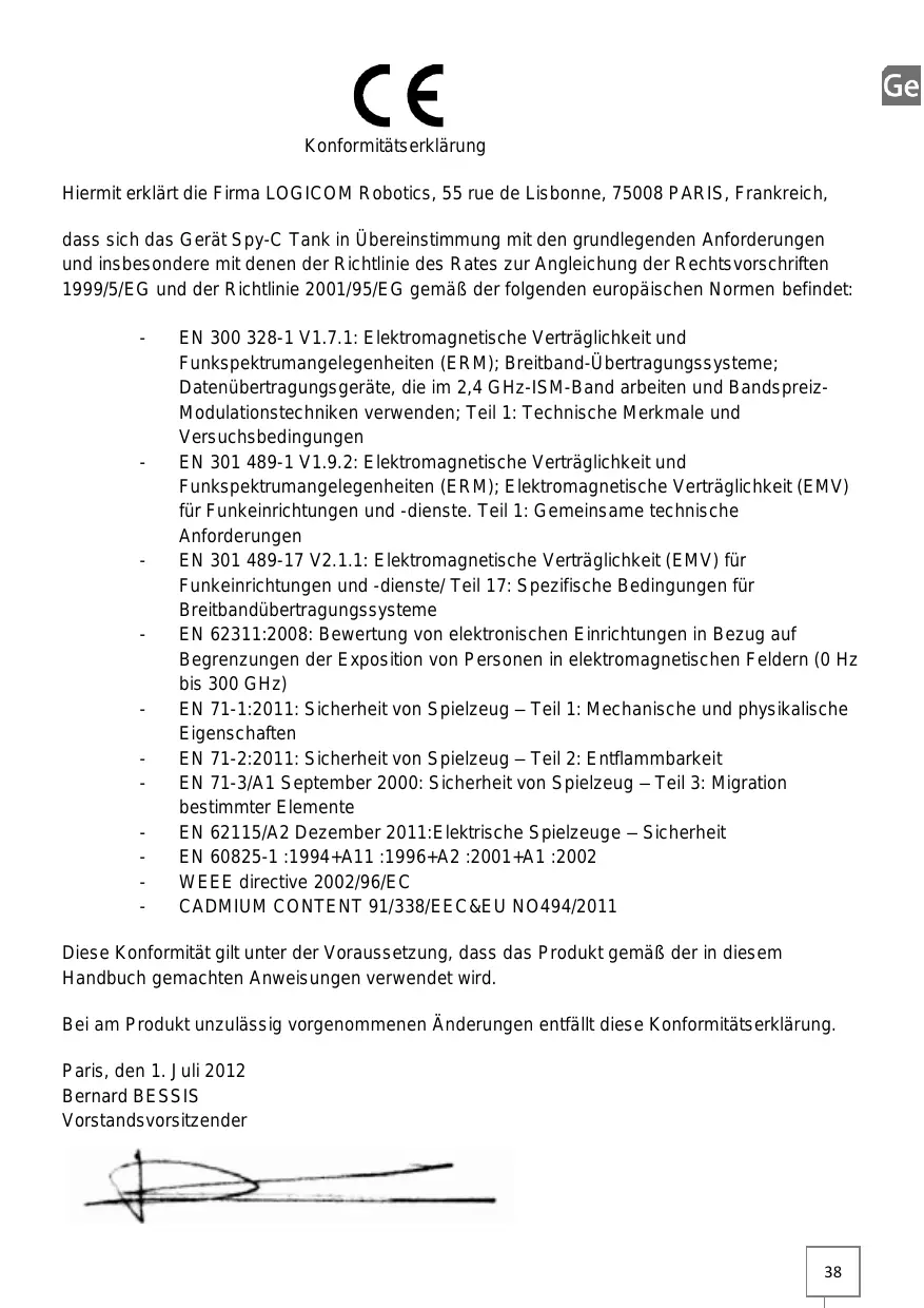Konformitätserklärung Hiermit erklärt die Firma LOGICOM Robotics, 55 rue de Lisbonne, 75008 PARIS, Frankreich, dass sich das Gerät Spy-C Tank in Übereinstimmung mit den grundlegenden Anforderungen und insbesondere mit denen der Richtlinie des Rates zur Angleichung der Rechtsvorschriften 1999/5/EG und der Richtlinie 2001/95/EG gemäß der folgenden europäischen Normen befindet: -