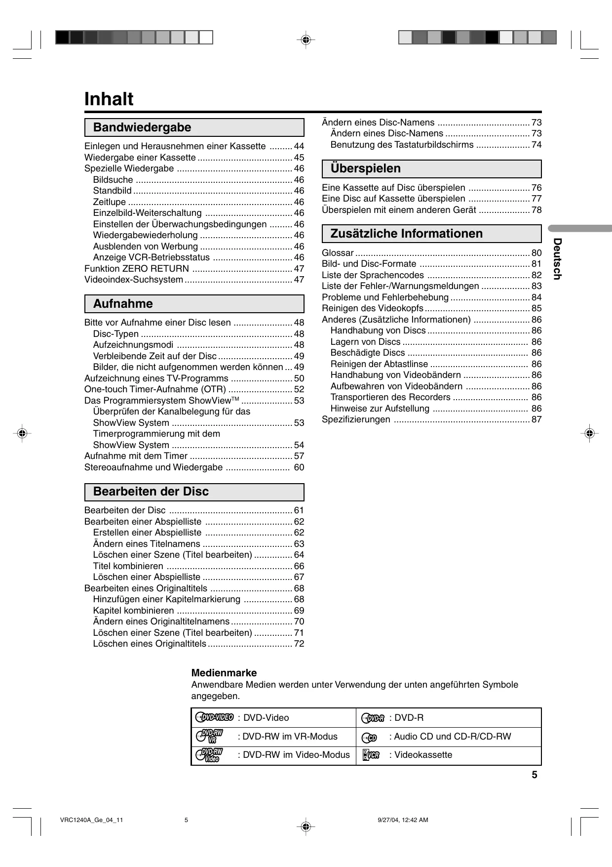 - 9/27/04, 12:42 AM Inhalt Bandwiedergabe Aufnahme Bitte vor Aufnahme einer Disc lesen p. 48