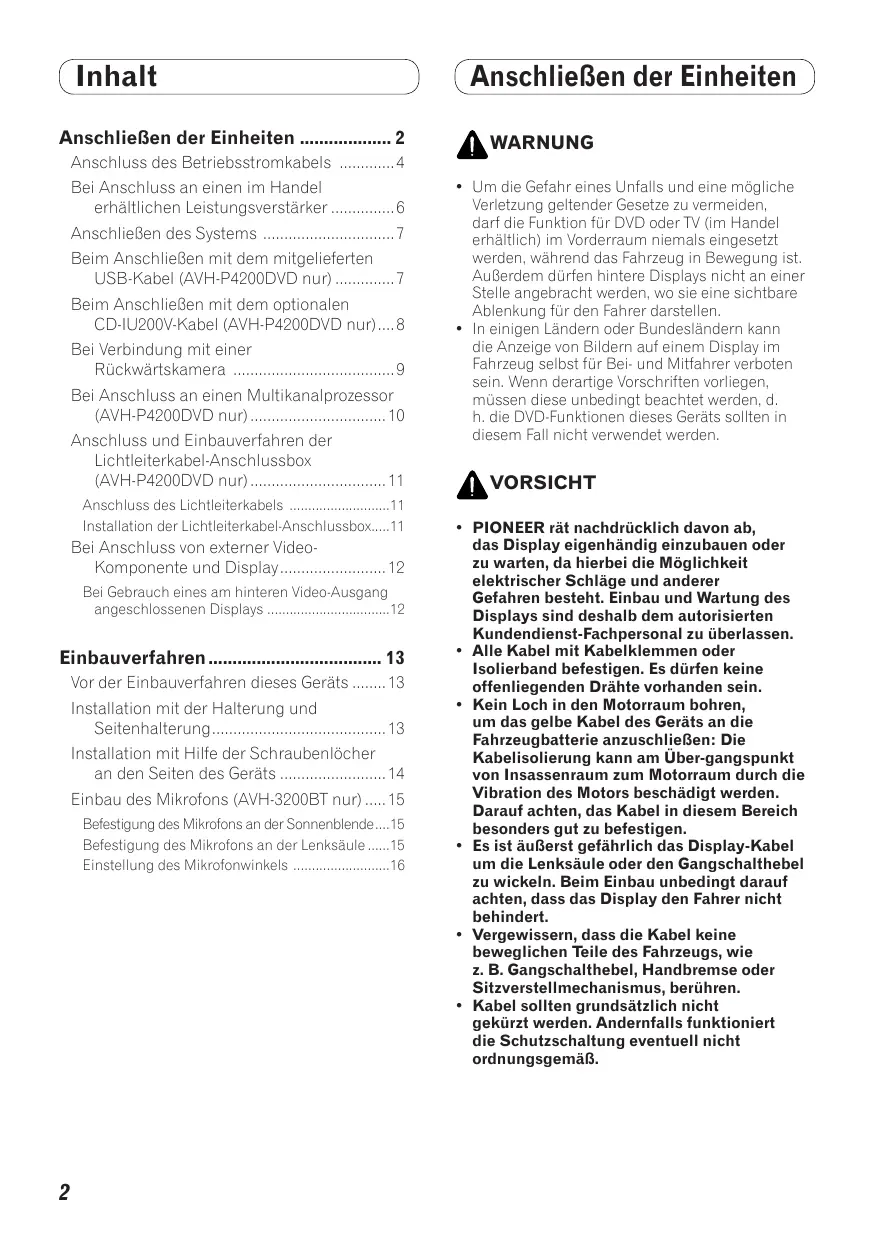 (Inhalt AnschlieBen der Einheiten .… Anschluss des Betriebsstromkabels 4 Bei Anschluss an einen im Handel erhältlichen Leistungsverstärker 6 AnschlieBen des Systems 7 Beim AnschlieBen mit dem mitgelieferten USB-Kabel (AVH-P4200DVD nur) 7 Beim AnschlieBen mit dem optionalen CD-IU200V-Kabel (AVH-P4200DVD nur).….8 Bei Verbindung mit einer Rückwärtskamera 9 Bei Anschluss an einen Multikanalprozessor (AVH-P4200DVD nur) 10 Anschluss und Einbauverfahren der Lichtleiterkabel-Anschlussbox (AVH-P4200DVD nur) 11 Anschluss des Lichtleiterkabels Li Installation der Lichtleiterkabel-Anschlussbox..11 Bei Anschluss von externer Video- Komponente und Display 12 Bei Gebrauch eines am hinteren Video-Ausgang angeschlossenen Displays 12 Einbauverfahren .13 Vor der Einbauverfahren dieses Geräts 13 Installation mit der Halterung und Seitenhalterung 13 Installation mit Hilfe der Schraubenlôcher an den Seiten des Geräts 14 Einbau des Mikrofons (AVH-3200BT nur) ….15 Befestigung des Mikrofons an der Sonnenblende.…15 Befestigung des Mikrofons an der Lenksäule …15 Einstellung des Mikrofonwinkels 16 (AnschlieBen der Einheiten ) À warnuNe Um die Gefahr eines Unfalls und eine mêgliche Verletzung geltender Gesetze zu vermeiden, darf die Funktion für DVD oder TV (im Handel erhältlich) im Vorderraum niemals eingesetzt werden, während das Fahrzeug in Bewegung ist. AuBerdem dürfen hintere Displays nicht an einer Stelle angebracht werden, wo sie eine sichtbare Ablenkung für den Fahrer darstellen In einigen Ländern oder Bundesländern kann die Anzeige von Bildern auf einem Display im Fahrzeug selbst für Bei- und Mitfahrer verboten sein. Wenn derartige Vorschriften vorliegen, müssen diese unbedingt beachtet werden, d h. die DVD-Funktionen dieses Geräts soliten in diesem Fall nicht venwendet werden À vorsicHT PIONEER rät nachdrücklich davon ab, das Display eigenhändig einzubauen oder zu warten, da hierbei die Môglichkeit elektrischer Schläge und anderer Gefahren besteht. Einbau und Wartung des Displays sind deshalb dem autorisierten Kundendienst-Fachpersonal zu überlassen. Alle Kabel mit Kabelklemmen oder band befestigen. Es dürfen keine iegenden Drähte vorhanden sein. Kein Loch in den Motorraum bohren, um das gelbe Kabel des Geräts an die Fahrzeugbatterie anzuschlieBe Kabelisolierung kann am Über-gangspunkt von Insassenraum zum Motorraum durch die Vibration des Motors beschädigt werden. Darauf achten, das Kabel in diesem Bereich besonders gut zu befestigen. Es ist äuBerst gefährlich das Display-Kabel um die Lenksäule oder den Gangschalthebel zu wickeln. Beim Einbau unbedingt darauf achten, dass das Display den Fahrer nicht behindert. Vergewissern, dass die Kabel keine beweglichen Teile des Fahrzeugs, wie z.B. Gangschalthebel, Handbremse oder Sitzverstellmechanismus, berühren. Kabel sollten grundsätzlich nicht gekürzt werden. Andernfalls funktioniert die Schutzschaltung eventuell nicht ordnungsgemäB.