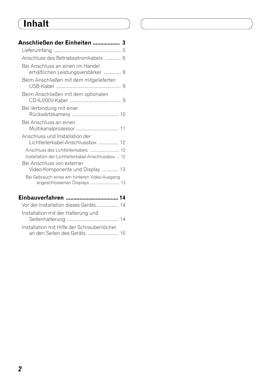 (Inhalt AnschlieBen der Einheiten … Lieferumfang Anschluss des Betriebsstromkabels Bei Anschluss an einen im Handel erhältlichen Leistungsverstärker ……… 8 Beim AnschlieBen mit dem ritglieterten USB-KAbEl mn. anne À Beim AnschlieBen mit dem naptonalen CD-IU2OOV-KADEL mme À Bei Verbindung mit einer RÜCKWÉTSKAMENE nn. 10 Bei Anschluss an einen MUITIKANAIDEOZESSON nn 11 Anschluss und Installation der Lichtleiterkabel-Anschlussbox . Anschluss des Lichtleiterkabels …. . Installation der Lichtleiterkabel-Anschlussbox … 12 Bei Anschluss von externer Video-Komponente und Display 18 Bei Gebrauch eines am hinteren Video: Ausgang angeschlossenen Displays ….. 13 Einbauverfahren … 14 Vor der Installation dieses Geräts 14 Installation mit der Falterung und Seitenhalterung . nn 14 Installation mit Hilfe der Schraubenlôcher an den Seiten des Geräts ……... 15