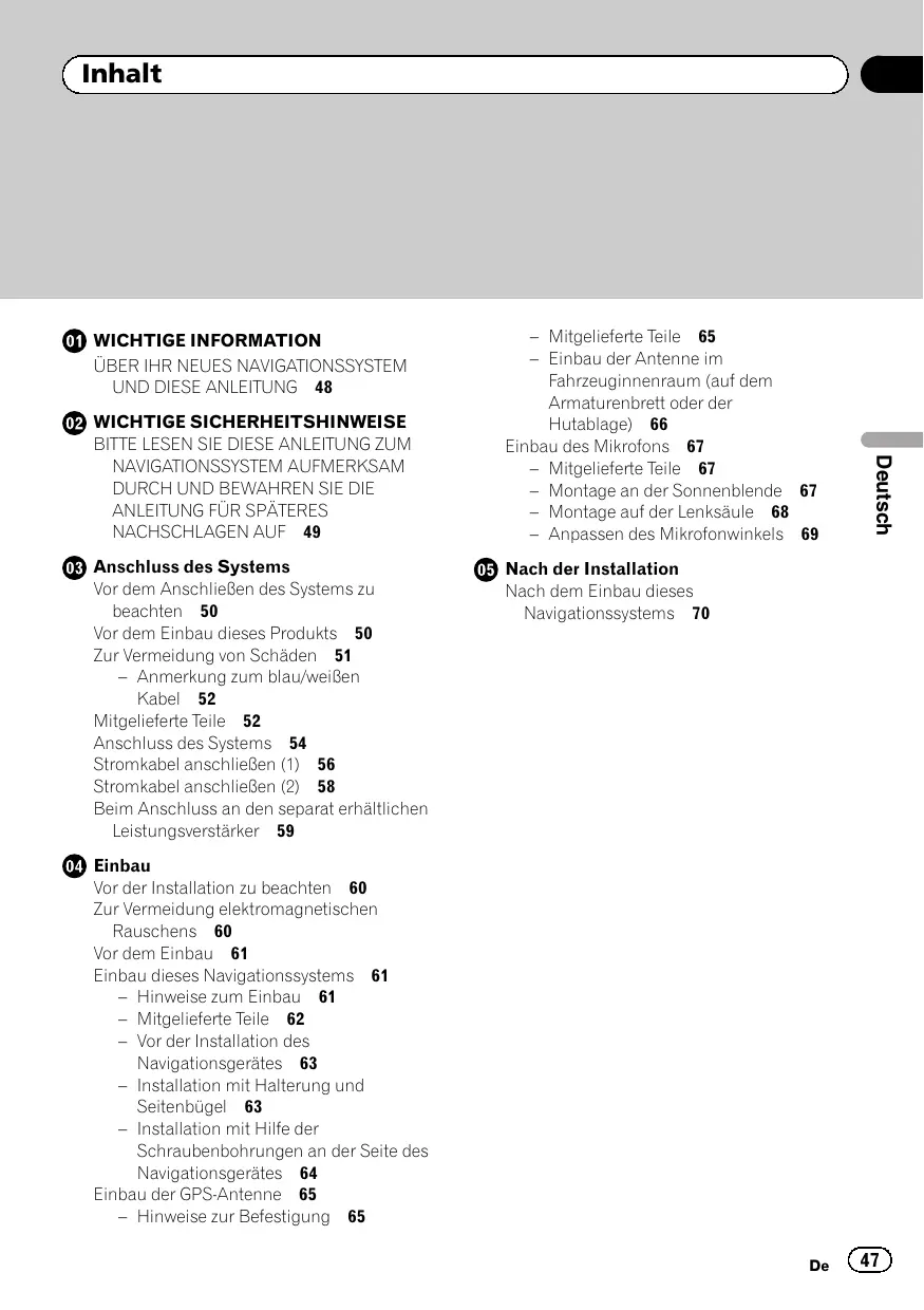 WICHTIGE SICHERHEITSHINWEISE BITTE LESEN SIE DIESE ANLEITUNG ZUM NAVIGATIONSSYSTEM AUFMERKSAM DURCH UND BEWAHREN SIE DIE ANLEITUNG FÜR SPÄTERES NACHSCHLAGEN AUF 49