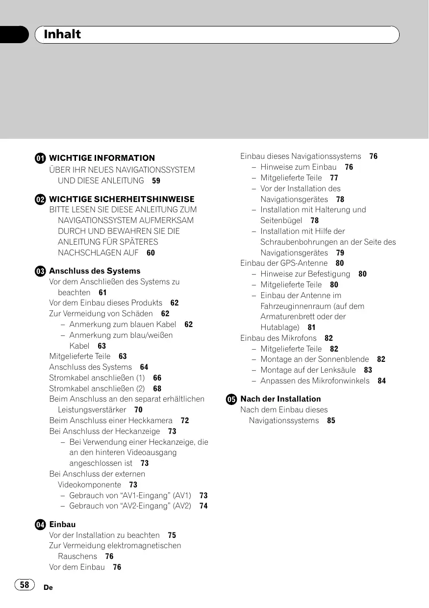 Einbau dieses Navigationssystems 76 Hinweise zum Einbau 76 Mitgelieferte Teile 77 Vor der Installation des Navigationsgerätes 78 Installation mit Halterung und Seitenbügel 78 Installation mit Hilfe der Schraubenbohrungen an der Seite des Navigationsgerätes 79 Einbau der GPS-Antenne 80 — Hinweise zur Befestigung 80 — Mitgelieferte Teile 80 — Einbau der Antenne im Fahrzeuginnenraum (auf dem Armaturenbrett oder der Hutablage) 81 Einbau des Mikrofons 82 — Mitgelieferte Teile 82 — Montage an der Sonnenblende 82 — Montage auf der Lenksäule 83 — Anpassen des Mikrofonwinkels 84 @ Nach der Installation Nach dem Einbau dieses Navigationssystems 85 — Bei Verwendung einer Heckanzeige, die an den hinteren Videoausgang angeschlossen ist 73 Bei Anschluss der externen Videokomponente 73 — Gebrauch von “AV1-Eingang" (AV1) — Gebrauch von “AV2-Eingang" (AV2) @® Einbau Vor der Installation zu beachten 15 Zur Vermeidung elektromagnetischen Rauschens 76 Vor dem Einbau 76 (8) De