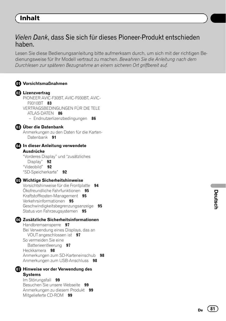 (Inhalt } _ jiclen Dank, dass Sie sich für dieses Pioneer-Produkt entschieden aben. Lesen Sie diese Bedienungsanleitung bitte aufmerksam durch, um sich mit der richtigen Be- dienungsweise für Ihr Modell vertraut zu machen. Bewahren Sie die Anleitung nach dem Durchlesen zur späteren Bezugnahme an einem sicheren Ort griffbereit auf. @ Vorsichtsmañnahmen @ Lizenzvertrag