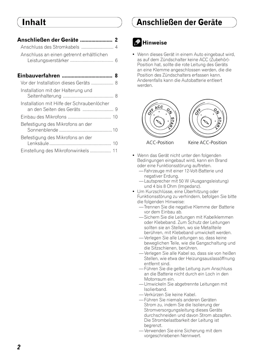 - Wenn dieses Gerät in einem Auto eingebaut wird, as auf dem Zündschalter keine ACC (Zubehör)Position hat, sollte die rote Leitung des Geräts an eine Klemme angeschlossen werden, die die Position des Zündschalters erfassen kann. Anderenfalls kann die Autobatterie entleert werden.