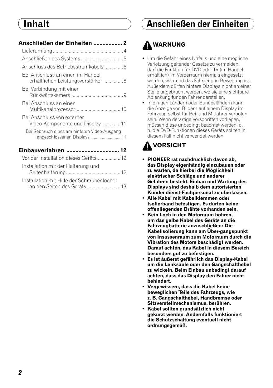 - PIONEER rät nachdrücklich davon ab, das Display eigenhändig einzubauen oder zu warten, da hierbei die Möglichkeit elektrischer Schläge und anderer Gefahren besteht. Einbau und Wartung des Displays sind deshalb dem autorisierten Kundendienst-Fachpersonal zu überlassen.