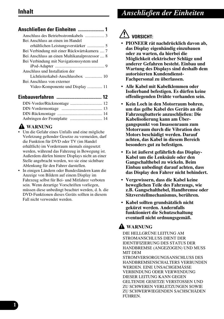 Inhalt AnschlieBen der Einheiten . Anschluss des Betriebsstromkabels Bei Anschluss an einen im Handel erhältlichen Leistungsverstärker Bei Verbindung mit einer Rückwärtskamera Bei Anschluss an einen Multikanalprozessor … 8 Bei Verbindung mit Navigationss Lichtleiterkabel-Anschlussbox . Bei Anschluss von externer Video-Komponente und Display … Einbauverfahren . DIN-Vorder/Rückmontage DIN-Vordermontage DIN-Rückmontage Anbringen der Frontplatte À WARNUNG + Um die Gefahr eines Unfalls und eine mügliche Verletzung geltender Gesetze zu vermeiden, darf die Funktion für DVD oder TV (im Handel erhältlich) im Vorderraum niemals eingesetzt werden, während das Fahrzeug in Bewegung ist. AuBerdem dürfen hintere Displays nicht an einer Stelle angebracht werden, wo sie eine htbare Ablenkung für den Fahrer darstellen. In einigen Ländern oder Bundesländern kann die Anzeige von Bildern auf einem Display im Fahrzeug selbst für Bei- und Mitfahrer verboten sein. Wenn derartige Vorschriften vorliegen, müssen diese unbedingt beachtet werden, d. h. die DVD-Funktionen dis Geräts sollten in diesem Fall nicht verwendet werden. nachdrücklich davon ab, das Display eigenhändig einzubauen oder zu warten, da hierbei die Môglichkeit elektrischer Schläge und anderer Gefahren besteht. Einbau und Wartung des Displays sind deshalb dem autorisierten Kundendienst- Fachpersonal zu überlassen. Alle Kabel mit Kabelklemmen oder Isolierband befestigen. Es dürfen keine offenliegenden Drähte vorhanden sein. Kein Loch in den Motorraum bohren, um das gelbe Kabel des Geräts an die Fahrzeugbatterie anzuschlieen: Die Kabelisolierung kann am Über- gangspunkt von Insassenraum zum Motorraum durch die Vibration des Motors beschädigt werden. Darauf achten, das Kabel in diesem Bereich besonders gut zu befestigen. Es ist äuBerst gefährlich das Display- Kabel um die Lenksäule oder den Gangschalthebel zu wickeln. Beim Einbau unbedingt darauf achten, dass das Display den Fahrer nicht behindert. + Vergewissern, dass die Kabel keine beweglichen Teile des Fahrzeugs, wie z.B. Gangschalthebel, Handbremse oder Sitzverstellmechanismus, berühren. Kabel sollten grundsätzlich nicht gekürzt werden. Andernfalls funktioniert die Schutzschaltung eventuell nicht ordnungsgemä. À WARNUNG