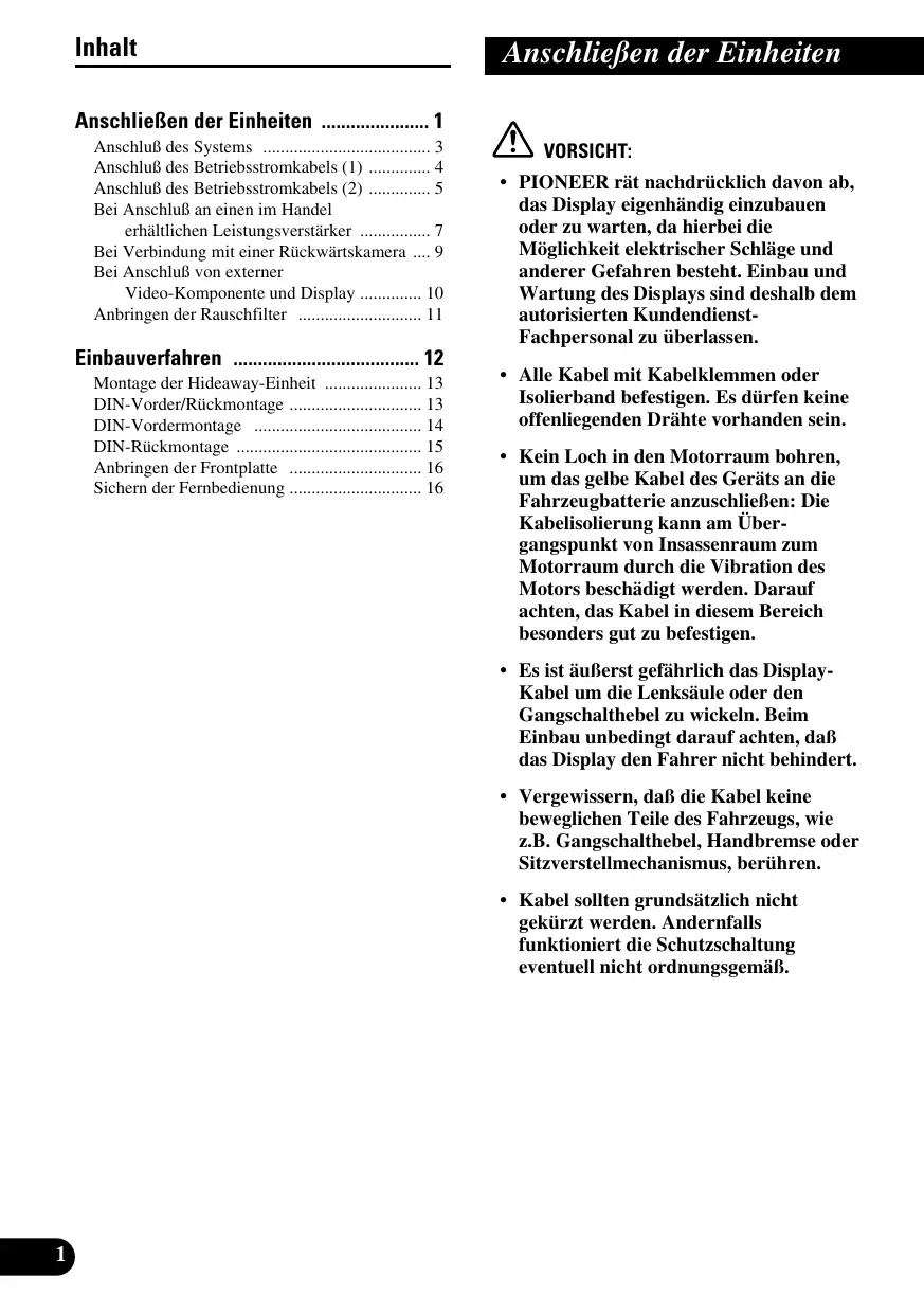 - PIONEER rät nachdrücklich davon ab, das Display eigenhändig einzubauen oder zu warten, da hierbei die Möglichkeit elektrischer Schläge und anderer Gefahren besteht. Einbau und Wartung des Displays sind deshalb dem autorisierten KundendienstFachpersonal zu überlassen.