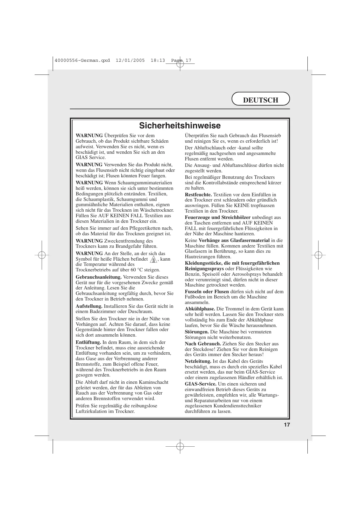Il est nécessaire d’inspecter régulièrement le tuyau ou la conduite de ventilation et d’éliminer les accumulations éventuelles de peluches. Les entrées et sorties doivent être libres d’obstructions. Si le sèche-linge est utilisé fréquemment, les intervalles entre les inspections doivent être réduits en conséquence. Degré de séchage. Les vêtements doivent être essorés en machine ou à la main avant d’être placés dans le sèche-linge. Les vêtements qui dégoulinent NE DOIVENT PAS être mis dans le sèche-linge. Enlevez les briquets et les allumettes des poches et veillez à ne JAMAIS utiliser de liquides inflammables à proximité de la machine. Les rideaux en fibres de verre ne doivent jamais être placés dans cette machine. La contamination d’autres vêtements par les fibres de verre peut entraîner des irritations de la peau. Les vêtements traités ou contaminés par des produits de nettoyage ou des liquides inflammables, comme le pétrole, l’huile de cuisson ou les aérosols ne doivent pas être placés dans la machine. Veillez à ce que les peluches ne puissent pas s’accumuler sur le sol, à l’extérieur de la machine. Période de refroidissement. Il se peut que l’intérieur du tambour soit très chaud. Veillez à ce que le sèche-linge termine son cycle de refroidissement avant d’en sortir le linge. Pannes. Cessez d’utiliser la machine si elle semble défectueuse. Après usage. Débranchez du courant de secteur. Retirez toujours la prise avant de nettoyer la machine. Cordon d’alimentation. Si le cordon d’alimentation de cet appareil est endommagé, il doit être remplacé par un cordon spécial exclusivement disponible auprès de GIAS Service ou d’un distributeur agréé. Service GIAS. Pour veiller au fonctionnement sûr et efficace de cet appareil, il est conseillé de faire appel à un technicien agréé pour les entretiens et les réparations.