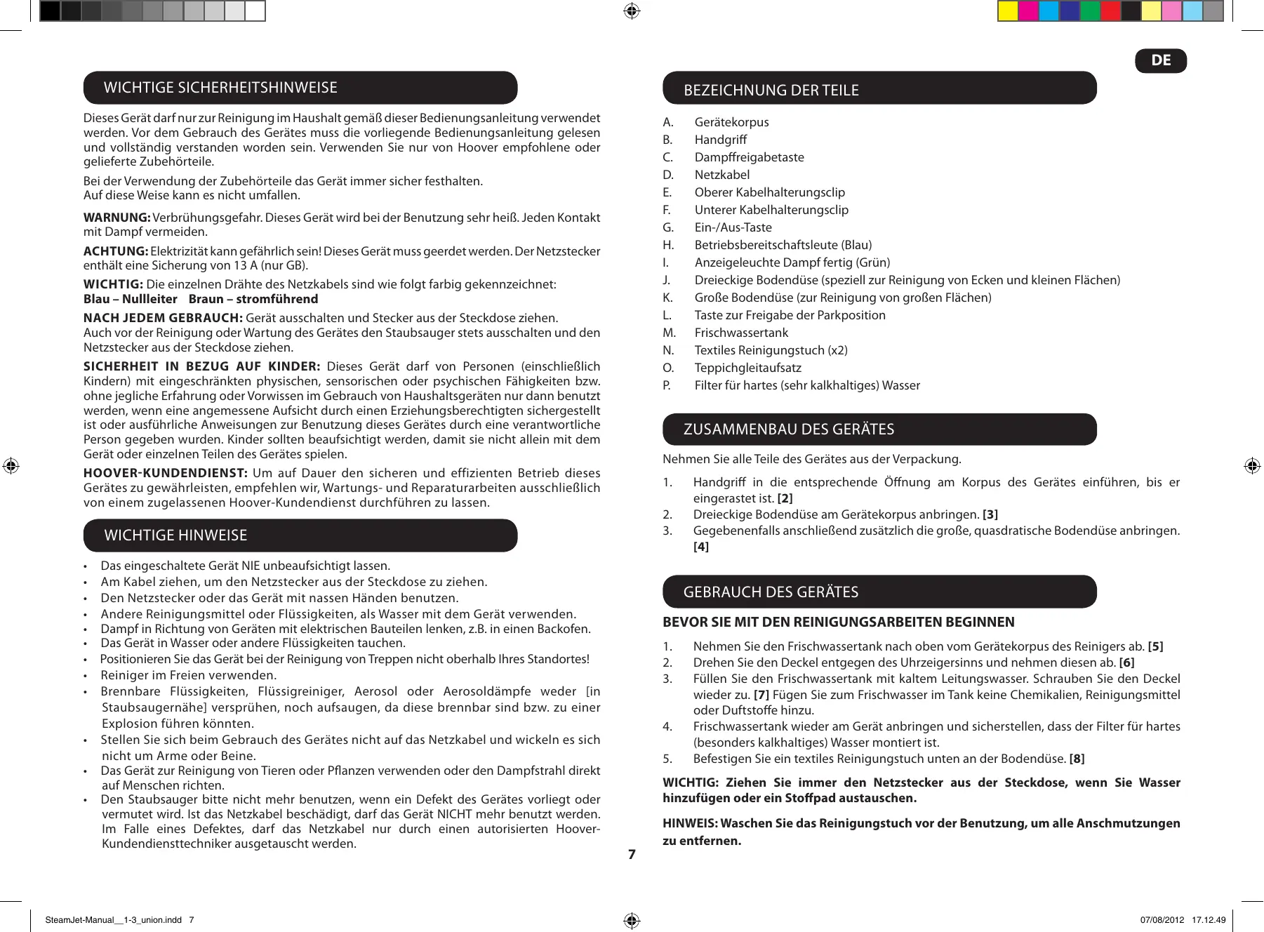 • Den Staubsauger bitte nicht mehr benutzen, wenn ein Defekt des Gerätes vorliegt oder vermutet wird. Ist das Netzkabel beschädigt, darf das Gerät NICHT mehr benutzt werden. Im Falle eines Defektes, darf das Netzkabel nur durch einen autorisierten HooverKundendiensttechniker ausgetauscht werden. SteamJet-Manual__1-3_union.indd 7 Gerätekorpus Handgriff Dampffreigabetaste Netzkabel Oberer Kabelhalterungsclip Unterer Kabelhalterungsclip Ein-/Aus-Taste Betriebsbereitschaftsleute (Blau) Anzeigeleuchte Dampf fertig (Grün) Dreieckige Bodendüse (speziell zur Reinigung von Ecken und kleinen Flächen) Große Bodendüse (zur Reinigung von großen Flächen) Taste zur Freigabe der Parkposition Frischwassertank Textiles Reinigungstuch (x2) Teppichgleitaufsatz Filter für hartes (sehr kalkhaltiges) Wasser Handgriff in die entsprechende Öffnung am Korpus des Gerätes einführen, bis er eingerastet ist. [2] Dreieckige Bodendüse am Gerätekorpus anbringen. [3] Gegebenenfalls anschließend zusätzlich die große, quasdratische Bodendüse anbringen. [4] Gebrauch des Gerätes