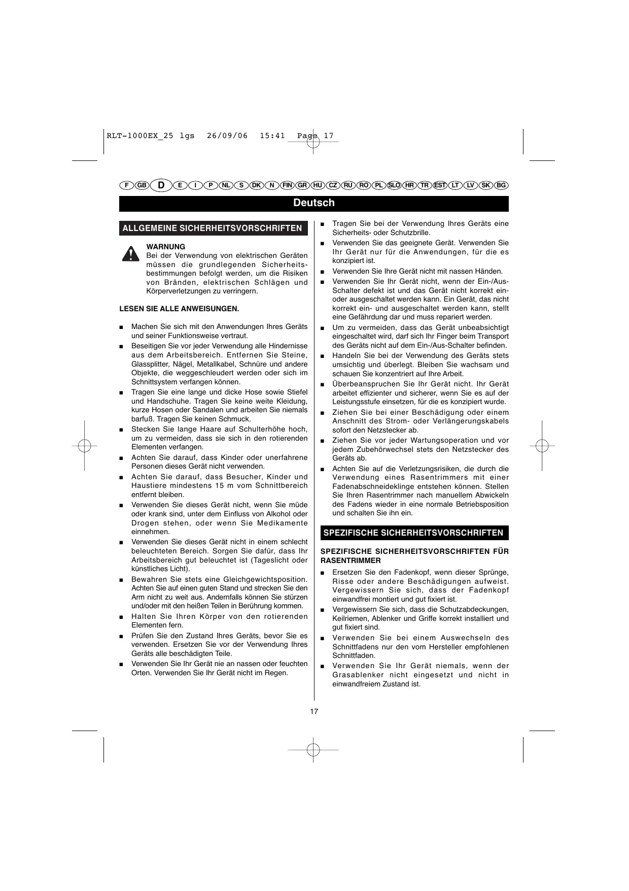 FIN GR HU CZ RU RO PL SLO HR TR EST LT LV SK BG Deutsch WARNUNG Vergewissern Sie sich, dass der Fadenkopf nicht mehr rotiert. Der Kontakt mit einem rotierenden Fadenkopf kann zu Verletzungen führen.