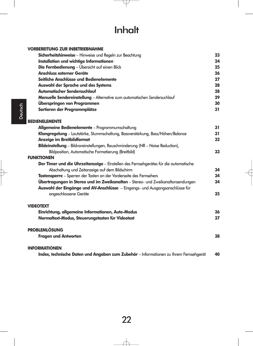 Inhalt VORBEREITUNG ZUR INBETRIEBNAHME Sicherheitshinweise – Hinweise und Regeln zur Beachtung Installation und wichtige Informationen Die Fernbedienung – Übersicht auf einen Blick Anschluss externer Geräte Seitliche Anschlüsse und Bedienelemente Auswahl der Sprache und des Systems Automatischer Sendersuchlauf Manuelle Sendereinstellung – Alternative zum automatischen Sendersuchlauf Überspringen von Programmen Sortieren der Programmplätze BEDIENELEMENTE Allgemeine Bedienelemente – Programmumschaltung Klangregelung – Lautstärke, Stummschaltung, Bassverstärkung, Bass/Höhen/Balance Anzeige im Breitbildformat Bildeinstellung – Bildvoreinstellungen, Rauschminderung (NR – Noise Reduction), Bildposition, Automatische Formatierung (Breitbild) FUNKTIONEN Der Timer und die Uhrzeitanzeige – Einstellen des Fernsehgerätes für die automatische Abschaltung und Zeitanzeige auf dem Bildschirm Tastensperre – Sperren der Tasten an der Vorderseite des Fernsehers Übertragungen in Stereo und im Zweikanalton – Stereo- und Zweikanaltonsendungen Auswahl der Eingänge und AV-Anschlüsse – Eingangs- und Ausgangsanschlüsse für angeschlossene Geräte