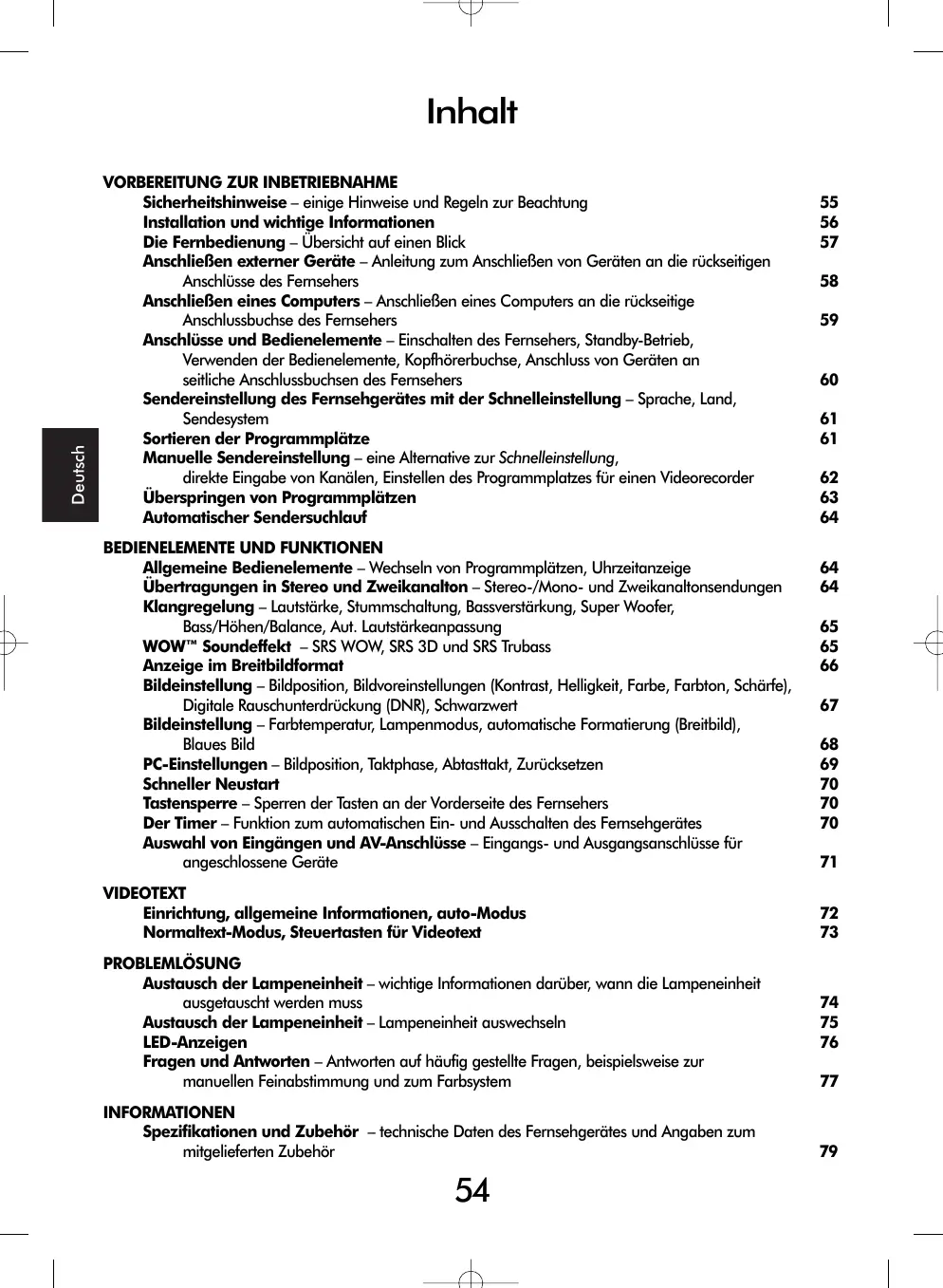 Inhalt VORBEREITUNG ZUR INBETRIEBNAHME Sicherheitshinweise – einige Hinweise und Regeln zur Beachtung Installation und wichtige Informationen Die Fernbedienung – Übersicht auf einen Blick Anschließen externer Geräte – Anleitung zum Anschließen von Geräten an die rückseitigen Anschlüsse des Fernsehers Anschließen eines Computers – Anschließen eines Computers an die rückseitige Anschlussbuchse des Fernsehers Anschlüsse und Bedienelemente – Einschalten des Fernsehers, Standby-Betrieb, Verwenden der Bedienelemente, Kopfhörerbuchse, Anschluss von Geräten an seitliche Anschlussbuchsen des Fernsehers Sendereinstellung des Fernsehgerätes mit der Schnelleinstellung – Sprache, Land, Sendesystem Sortieren der Programmplätze Manuelle Sendereinstellung – eine Alternative zur Schnelleinstellung, direkte Eingabe von Kanälen, Einstellen des Programmplatzes für einen Videorecorder Überspringen von Programmplätzen Automatischer Sendersuchlauf
