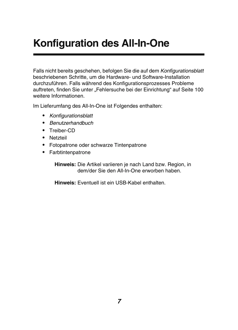 Konfigurationsblatt Benutzerhandbuch Treiber-CD Netzteil Fotopatrone oder schwarze Tintenpatrone Farbtintenpatrone Hinweis: Die Artikel variieren je nach Land bzw. Region, in dem/der Sie den All-In-One erworben haben. Hinweis: Eventuell ist ein USB-Kabel enthalten.