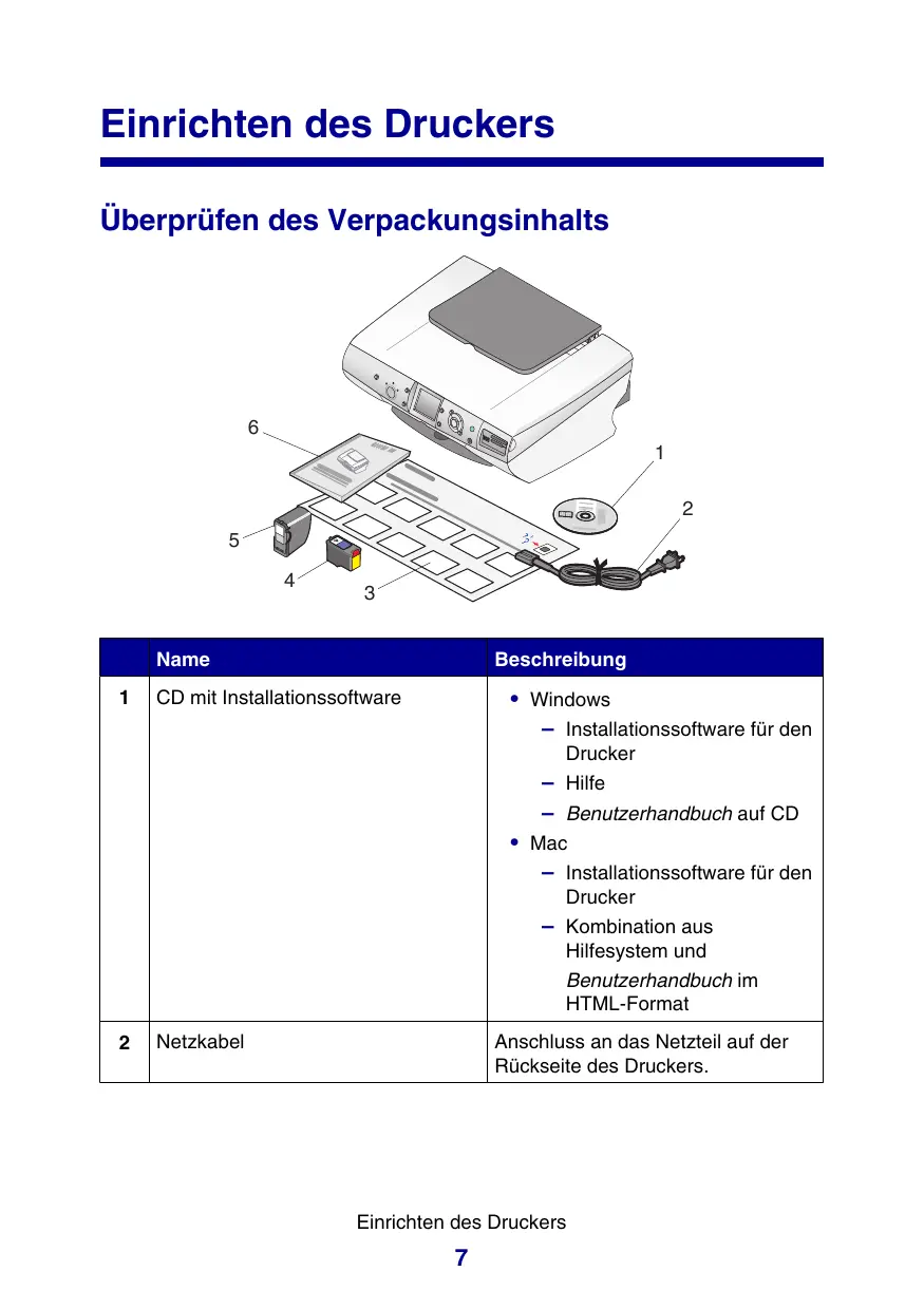 Einrichten des Druckers Überprüfen des Verpackungsinhalts