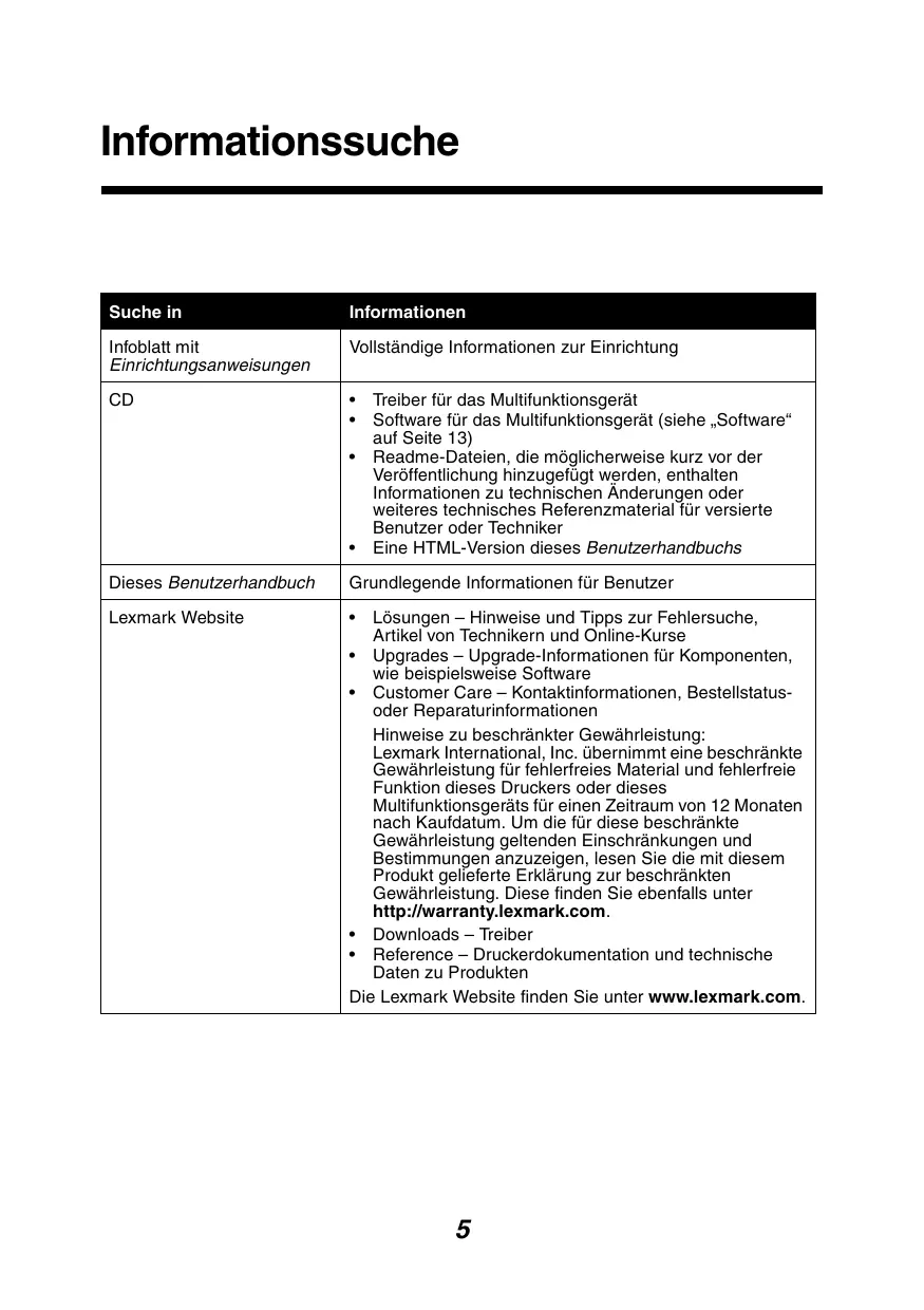 - Customer Care – Kontaktinformationen, Bestellstatusoder Reparaturinformationen Hinweise zu beschränkter Gewährleistung: Lexmark International, Inc. übernimmt eine beschränkte Gewährleistung für fehlerfreies Material und fehlerfreie Funktion dieses Druckers oder dieses Multifunktionsgeräts für einen Zeitraum von 12 Monaten nach Kaufdatum. Um die für diese beschränkte Gewährleistung geltenden Einschränkungen und Bestimmungen anzuzeigen, lesen Sie die mit diesem Produkt gelieferte Erklärung zur beschränkten Gewährleistung. Diese finden Sie ebenfalls unter http://warranty.lexmark.com.
