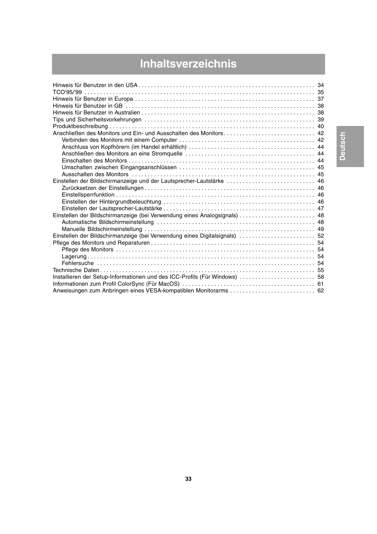 Hinweis für Benutzer in den USA . . . . . . . . . . . . . . . . . . . . . . . . . . . . . . . . . . . . . . . . . . . . . . . . . . . . . . . . TCO'95/'99 . . . . . . . . . . . . . . . . . . . . . . . . . . . . . . . . . . . . . . . . . . . . . . . . . . . . . . . . . . . . . . . . . . . . . . . . . Hinweis für Benutzer in Europa . . . . . . . . . . . . . . . . . . . . . . . . . . . . . . . . . . . . . . . . . . . . . . . . . . . . . . . . . Hinweis für Benutzer in GB . . . . . . . . . . . . . . . . . . . . . . . . . . . . . . . . . . . . . . . . . . . . . . . . . . . . . . . . . . . . Hinweis für Benutzer in Australien . . . . . . . . . . . . . . . . . . . . . . . . . . . . . . . . . . . . . . . . . . . . . . . . . . . . . . . Tips und Sicherheitsvorkehrungen . . . . . . . . . . . . . . . . . . . . . . . . . . . . . . . . . . . . . . . . . . . . . . . . . . . . . . Produktbeschreibung . . . . . . . . . . . . . . . . . . . . . . . . . . . . . . . . . . . . . . . . . . . . . . . . . . . . . . . . . . . . . . . . . Anschließen des Monitors und Ein- und Ausschalten des Monitors . . . . . . . . . . . . . . . . . . . . . . . . . . . . . Verbinden des Monitors mit einem Computer . . . . . . . . . . . . . . . . . . . . . . . . . . . . . . . . . . . . . . . . . . . Anschluss von Kopfhörern (im Handel erhältlich) . . . . . . . . . . . . . . . . . . . . . . . . . . . . . . . . . . . . . . . . Anschließen des Monitors an eine Stromquelle . . . . . . . . . . . . . . . . . . . . . . . . . . . . . . . . . . . . . . . . . Einschalten des Monitors . . . . . . . . . . . . . . . . . . . . . . . . . . . . . . . . . . . . . . . . . . . . . . . . . . . . . . . . . . . Umschalten zwischen Eingangsanschlüssen . . . . . . . . . . . . . . . . . . . . . . . . . . . . . . . . . . . . . . . . . . . Ausschalten des Monitors . . . . . . . . . . . . . . . . . . . . . . . . . . . . . . . . . . . . . . . . . . . . . . . . . . . . . . . . . . Einstellen der Bildschirmanzeige und der Lautsprecher-Lautstärke . . . . . . . . . . . . . . . . . . . . . . . . . . . . Zurücksetzen der Einstellungen . . . . . . . . . . . . . . . . . . . . . . . . . . . . . . . . . . . . . . . . . . . . . . . . . . . . . . Einstellsperrfunktion . . . . . . . . . . . . . . . . . . . . . . . . . . . . . . . . . . . . . . . . . . . . . . . . . . . . . . . . . . . . . . . Einstellen der Hintergrundbeleuchtung . . . . . . . . . . . . . . . . . . . . . . . . . . . . . . . . . . . . . . . . . . . . . . . . Einstellen der Lautsprecher-Lautstärke . . . . . . . . . . . . . . . . . . . . . . . . . . . . . . . . . . . . . . . . . . . . . . . . Einstellen der Bildschirmanzeige (bei Verwendung eines Analogsignals) . . . . . . . . . . . . . . . . . . . . . . . . Automatische Bildschirmeinstellung . . . . . . . . . . . . . . . . . . . . . . . . . . . . . . . . . . . . . . . . . . . . . . . . . . Manuelle Bildschirmeinstellung . . . . . . . . . . . . . . . . . . . . . . . . . . . . . . . . . . . . . . . . . . . . . . . . . . . . . . Einstellen der Bildschirmanzeige (bei Verwendung eines Digitalsignals) . . . . . . . . . . . . . . . . . . . . . . . . Pflege des Monitors und Reparaturen . . . . . . . . . . . . . . . . . . . . . . . . . . . . . . . . . . . . . . . . . . . . . . . . . . . . Pflege des Monitors . . . . . . . . . . . . . . . . . . . . . . . . . . . . . . . . . . . . . . . . . . . . . . . . . . . . . . . . . . . . . . . Lagerung . . . . . . . . . . . . . . . . . . . . . . . . . . . . . . . . . . . . . . . . . . . . . . . . . . . . . . . . . . . . . . . . . . . . . . . . Fehlersuche . . . . . . . . . . . . . . . . . . . . . . . . . . . . . . . . . . . . . . . . . . . . . . . . . . . . . . . . . . . . . . . . . . . . . Technische Daten . . . . . . . . . . . . . . . . . . . . . . . . . . . . . . . . . . . . . . . . . . . . . . . . . . . . . . . . . . . . . . . . . . . . Installieren der Setup-Informationen und des ICC-Profils (Für Windows) . . . . . . . . . . . . . . . . . . . . . . . . Informationen zum Profil ColorSync (Für MacOS) . . . . . . . . . . . . . . . . . . . . . . . . . . . . . . . . . . . . . . . . . . Anweisungen zum Anbringen eines VESA-kompatiblen Monitorarms . . . . . . . . . . . . . . . . . . . . . . . . . . .
