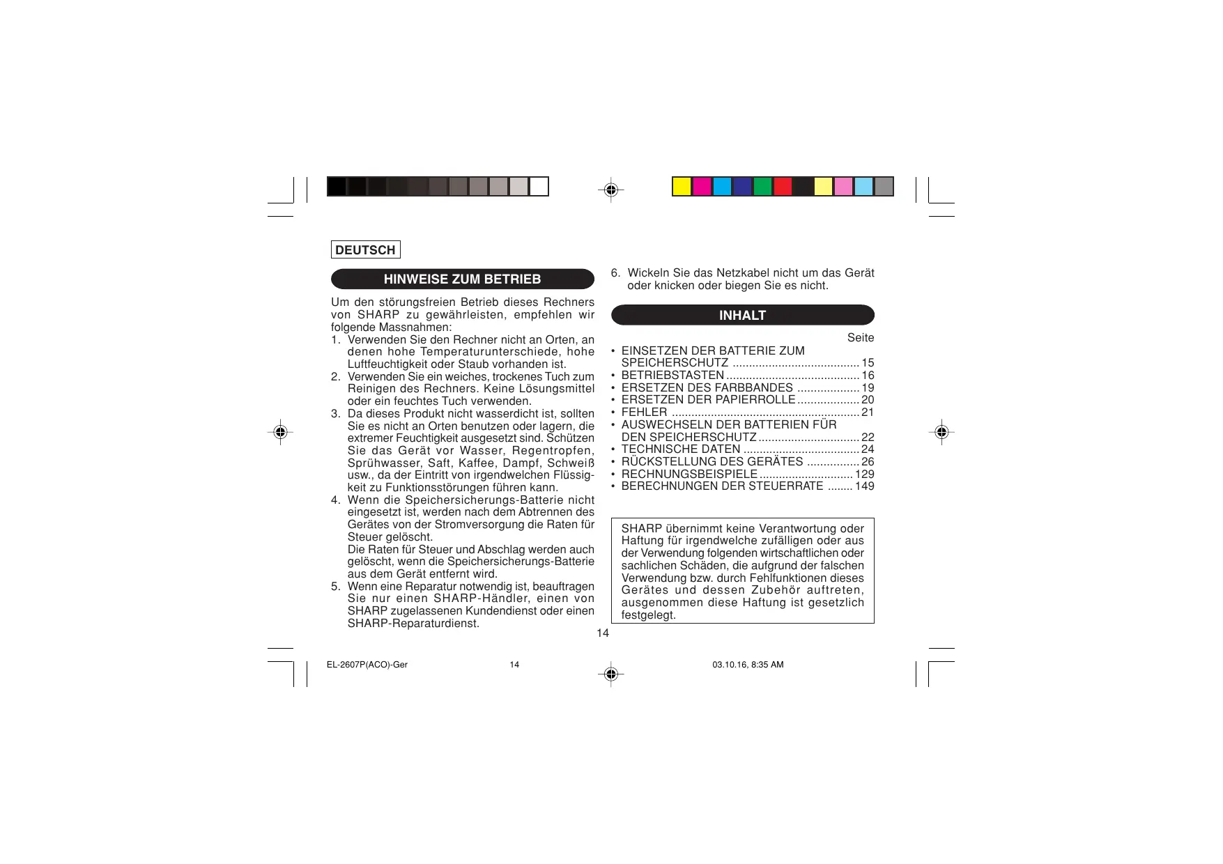BEDIENUNGSANLEITUNG EL-2607PG SHARP