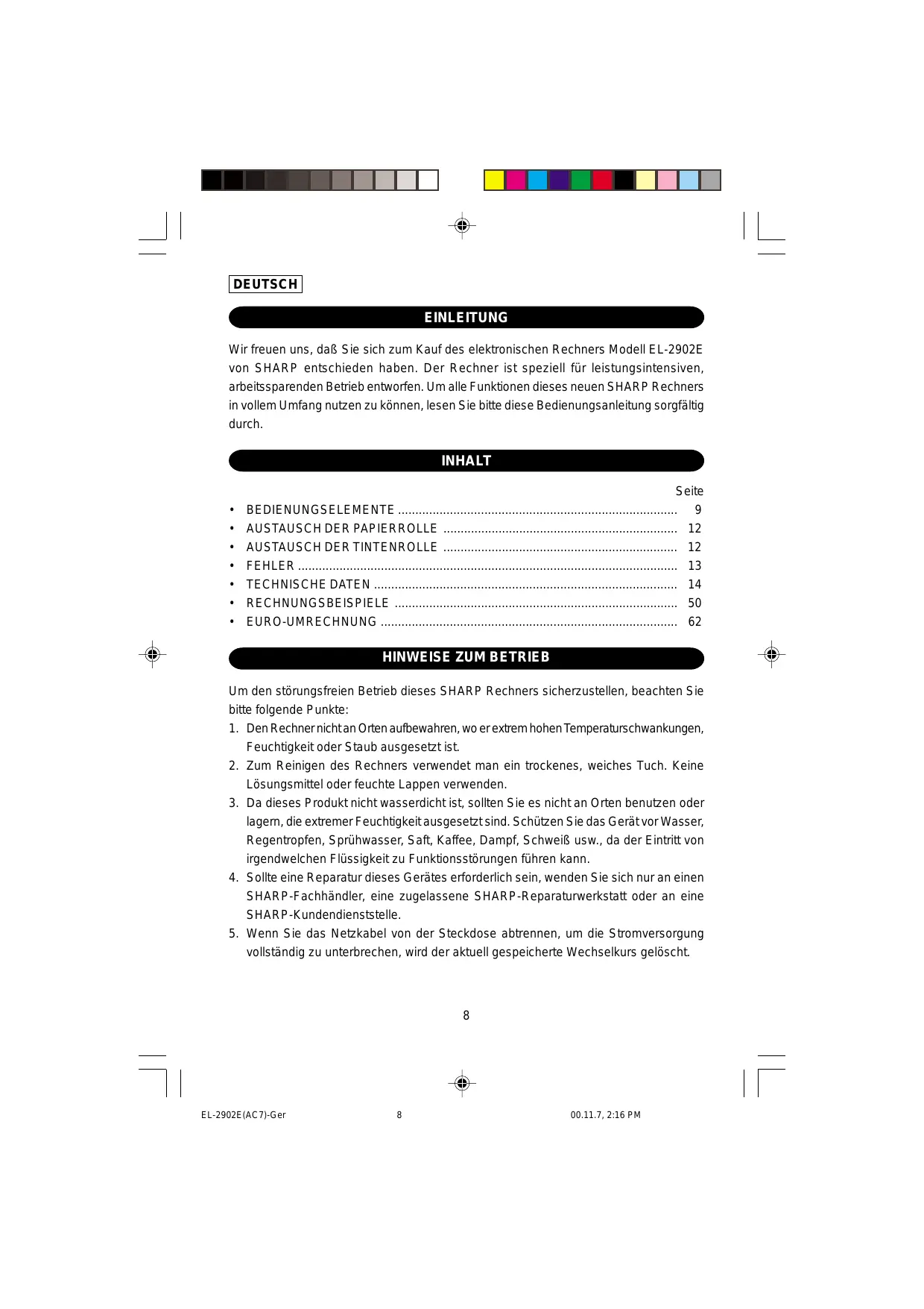 BEDIENUNGSANLEITUNG EL-2902E SHARP