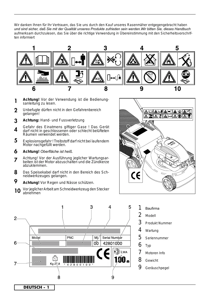 DEUTSCH - 1 Baufirma Modell Produkt Nummer Wartung Seriennummer Typ Motoren Info Gewicht Geräuschpegel SICHERHEITSHINWEISE SIcherheitsvorkehrungen für Handgeführte Rasenmäher mit Rotationsklinge. WICHTIG: Diese mähmaschine kann hände und füsse abtrennen und gegenstände mit hoher geschwin-digkeit schleudern. Nichtbeachtung der folgenden sicherheitsvorschriften könnte schwere oder tödliche verletzungen zur folge haben.