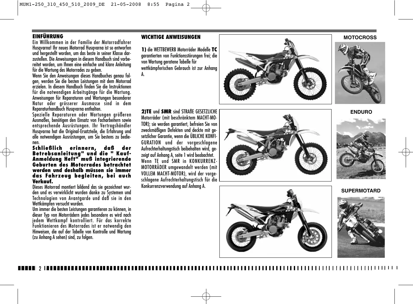 2)TE und SMR sind STRAßE GESETZLICHE Motorräder (mit beschränktem MACHT-MOTOR); sie werden garantiert, befreien Sie von zweckmäßigen Defekten und deckte mit gesetzlicher Garantie, wenn die ÜBLICHE KONFIGURATION und der vorgeschlagene Aufrechterhaltungstisch beibehalten wird, gezeigt auf Anhang A, seite 1 wird beobachtet. Wenn TE und SMR in KONKURRENZMOTORRÄDER umgewandelt werden (mit VOLLEM MACHT-MOTOR), wird der vorgeschlagene Aufrechterhaltungstisch für die Konkurrenzverwendung auf Anhang A. ENDURO SUPERMOTARD 21-05-2008 WICHTIG 8:55 Pagina 3 Der Hinweis für Anerkennung der Garantie wird die MOTORRAD-KONFIGURATION sein, wie unten gezeigt,: zu Lasten der Kunde für die notwendige Arbeitskräfte. ZUR BEACHTUNG: die Garantie verfällt bei Vermietung des Kraftrades. A) ÜBLICHES MOTORRAD, STRAßE GESETZLICH: mit beschränktem MACHT-MOTOR B) KONKURRENZ-MOTORRAD, das Machen EINEN WETTKAMPF MIT von der VERWENDUNG: mit VOLLEM MACHT-MOTOR. Wichtige Einleitung Die vorliegenden Betriebsanleitungen aufmerksam durchlesen und den Anmerkungen, denen die folgenden Hinweise vorausgehen, besondere Beachtung schenken : Dieses Motorrad wurde nicht ausgedacht, um immer höchstens einige Drehungen lange Reisen mit dem Motor vorzunehmen, wie es anläßlich langer Verschiebungen auf Straßen oder Autobahnen geschehen kann. Die langen Reisen in diese Bedingungen können zum ernste Schäden verursachen Motor. Dieses Motorrad wurde für die Wettkämpfe und den Abschluß gelernt es garantiert die besten Leistungen mit dem einzigen Fahrer. Sie rät ab deshalb sie mit dem Passagier benutzen, sowohl auf Straße, daß ins geländegängige. ACHTUNG *: Zeigt die Möglichkeit an, bei Nichtbeachtung der Anweisungen schwere persönliche Schäden bis zum Todesfall zu erleiden. WARNHINWEIS* : Zeigt die Möglichkeit an, bei Nichtbeachtung der Anweisungen persönliche Schäden zu erleiden oder Schäden am Fahrzeug zu verursachen. Anmerkung * : Liefert weitere nützliche Informationen. IMMER erinnern, daß diese Motorräder für die Wettkämpfe geplant wurden, das heißt für einen sehr verschiedenen Gebrauch von jenes Straßen. Um die "Garantie von Funktionieren" des Fahrzeuges zu erhalten, muß der Kunde dem Programm von Wartung folgen das auf ihn auf dem Libretto von Gebrauch und Wartung gezeigt wird, da führt es die bei den Werkstätten genehmigt HUSQVARNA vorgesehenen Abschnitte aus. Der Preis für den Ersatz der Stücke und um den Plan von Wartung zu beachten, ist er Austausch der Teile Im Falle des Austausches von Teilen, nur Original-HusqvarnaTeile mit entsprechenden Merkmalen einschließlich Typ, Widerstand und Material benutzen. Andernfalls könnten Fehlfunktionen mit möglicher Verletzungsgefahr auftreten.