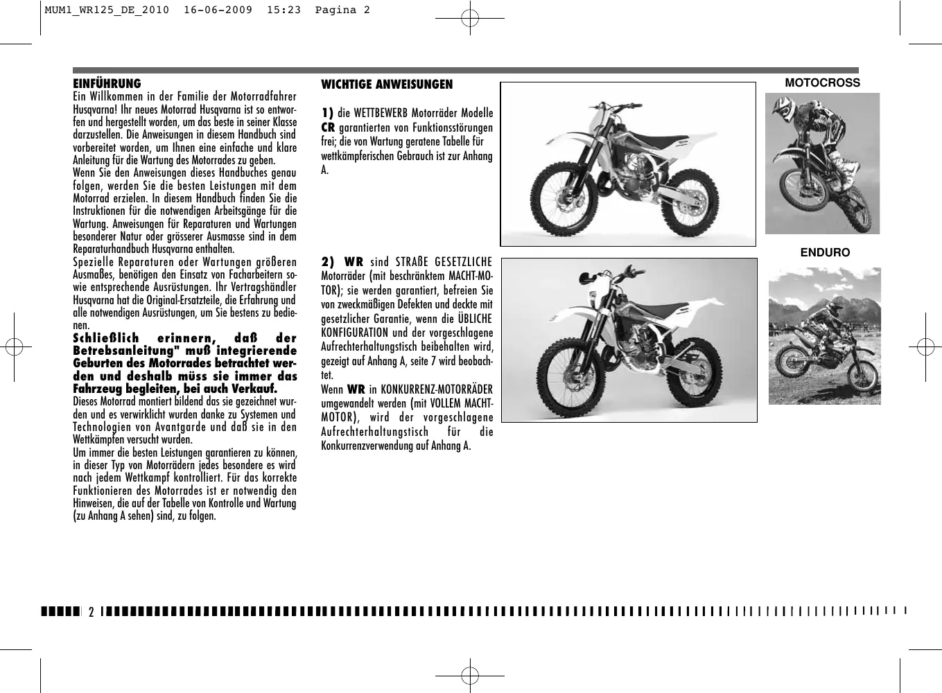 Motorräder (mit beschränktem MACHT-MOTOR); sie werden garantiert, befreien Sie von zweckmäßigen Defekten und deckte mit gesetzlicher Garantie, wenn die ÜBLICHE KONFIGURATION und der vorgeschlagene Aufrechterhaltungstisch beibehalten wird, gezeigt auf Anhang A, seite 7 wird beobachtet. Wenn WR in KONKURRENZ-MOTORRÄDER umgewandelt werden (mit VOLLEM MACHTMOTOR), wird der vorgeschlagene Aufrechterhaltungstisch für die Konkurrenzverwendung auf Anhang A. ENDURO 16-06-2009 15:23 Pagina 3 WICHTIG Der Hinweis für Anerkennung der Garantie wird die MOTORRAD-KONFIGURATION sein, wie unten gezeigt,: A) ÜBLICHES MOTORRAD, STRAßE GESETZLICH: mit beschränktem MACHT-MOTOR B) KONKURRENZ-MOTORRAD, das Machen EINEN WETTKAMPF MIT von der VERWENDUNG: mit VOLLEM MACHT-MOTOR. Dieses Motorrad wurde nicht ausgedacht, um immer höchstens einige Drehungen lange Reisen mit dem Motor vorzunehmen, wie es anläßlich langer Verschiebungen auf Straßen oder Autobahnen geschehen kann. Die langen Reisen in diese Bedingungen können zum ernste Schäden verursachen Motor. Dieses Motor rad wurde für die Wettkämpfe und den Abschluß gelernt es garantiert die besten Leistungen mit dem einzigen Fahrer. Sie rät ab deshalb sie mit dem Passagier benutzen, sowohl auf Straße, daß ins geländegängige. IMMER erinnern, daß diese Motorräder für die Wettkämpfe geplant wurden, das heißt für einen sehr verschiedenen Gebrauch von jenes Straßen. Um die “Garantie von Funktionieren” des Fahrzeuges zu erhalten, muß der Kunde dem Programm von Wartung folgen das auf ihn auf dem Libretto von Gebrauch und Wartung gezeigt wird, da führt es die bei den Werkstätten genehmigt HUSQVARNA vorgesehenen Abschnitte aus. Der Preis für den Ersatz der Stücke und um den Plan von Wartung zu beachten, ist er zu Lasten der Kunde für die notwendige Arbeitskräfte. ZUR BEACHTUNG: die Garantie verfällt bei Vermietung des Kraftrades. Wichtige Einleitung Die vorliegenden Betriebsanleitungen aufmerksam durchlesen und den Anmerkungen, denen die folgenden Hinweise vorausgehen, besondere Beachtung schenken: ACHTUNG*: Zeigt die Möglichkeit an, bei Nichtbeachtung der Anweisungen schwere persönliche Schäden bis zum Todesfall zu erleiden. WARNHINWEIS*: Zeigt die Möglichkeit an, bei Nichtbeachtung der Anweisungen persönliche Schäden zu erleiden oder Schäden am Fahrzeug zu verursachen. Anmerkung*: Liefert weitere nützliche Informationen. Austausch der Teile Im Falle des Austausches von Teilen, nur Original-HusqvarnaTeile mit entsprechenden Merkmalen einschließlich Typ, Widerstand und Material benutzen. ACHTUNG*: Nach einem Fall das Motorrad sorgfältig überprüfen. Sich vergewissern, daß die Gasschaltung, die Bremsen, die Kupplung und andere Hauptschaltungen und Komponenten nicht beschädigt wurden. Ein beschädigtes Motorrad zu fahren kann schwere Unfälle verursachen. ACHTUNG*: Das Motorrad nicht anlassen oder an ihm arbeiten, ohne vorher geeignete Schutzkleidung angezogen zu haben. Immer Schutzhelm, Stiefel, Handschuhe, Schutzbrille und andere geeignete Kleidung tragen. ACHTUNG*: Dieses Motorrad ist ein sofistiziertes Wettrennfahrzeug. Das Motorrad nicht anlassen und führen, wenn nicht über geeignete Anweisungen und ausgezeichneten körperlichen Zustand verfügt wird.